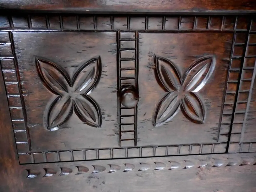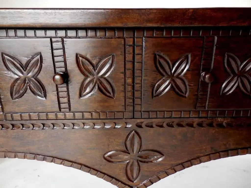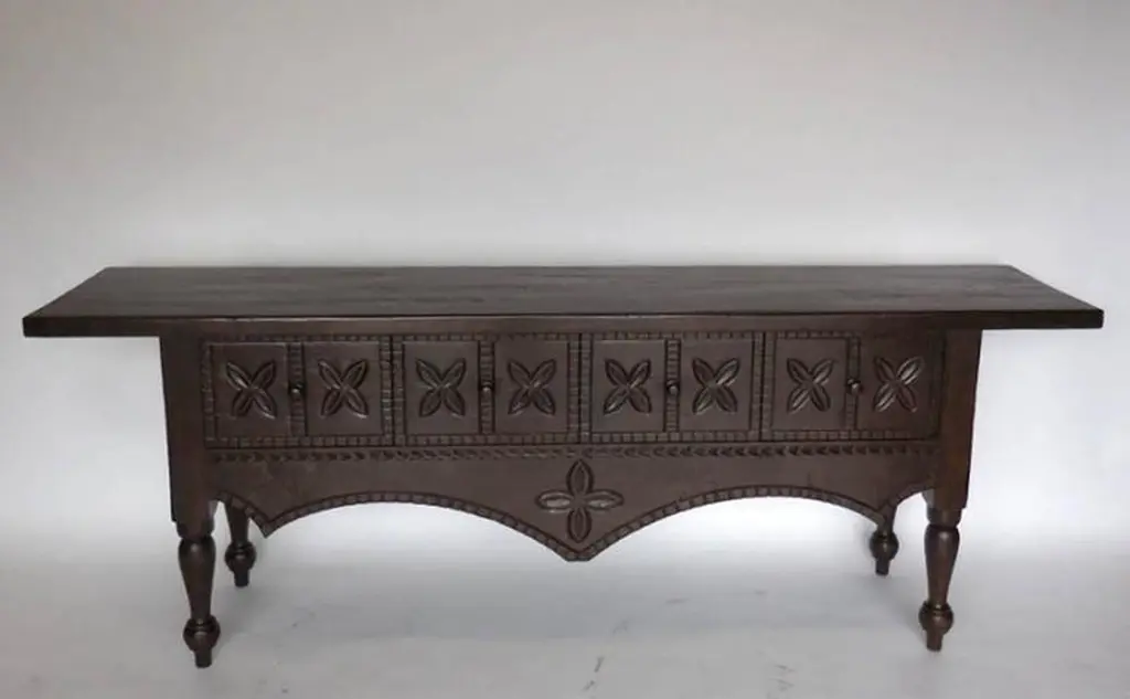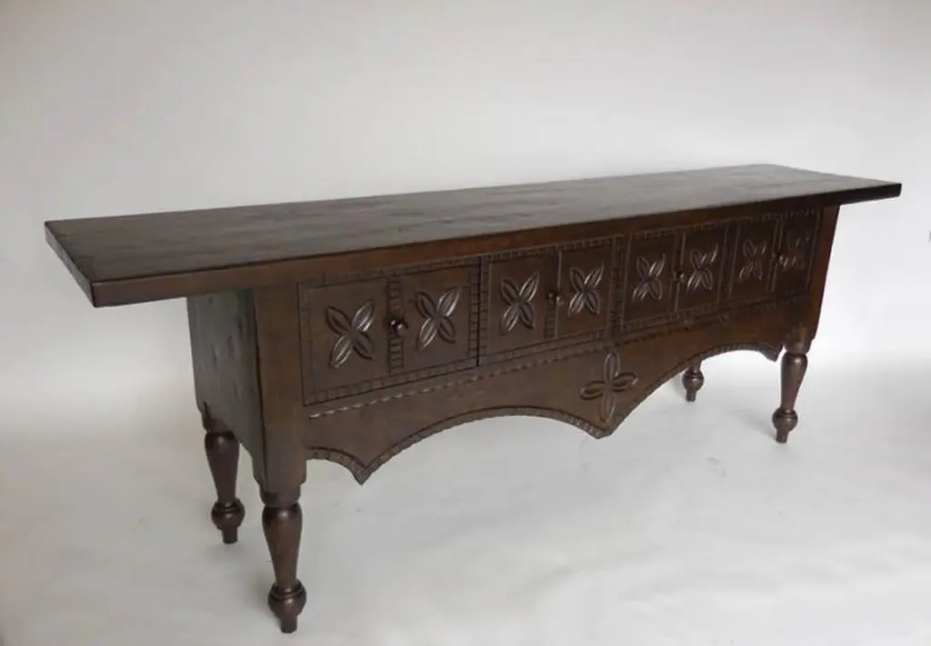 Beautifully carved walnut console with four drawers based on an indigenous Guatemalan design. Can be made in custom sizes and finishes. Made in Los Angeles by Dos Gallos Studio.CUSTOM PRICES ARE SUBJECT TO CHANGE. PLEASE INQUIRE BEFORE PLACING AN ORDER. CUSTOM ORDERS ARE NON RETURNABLE. FINAL SALE