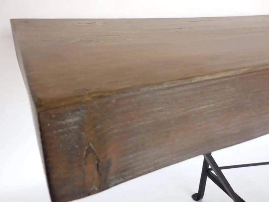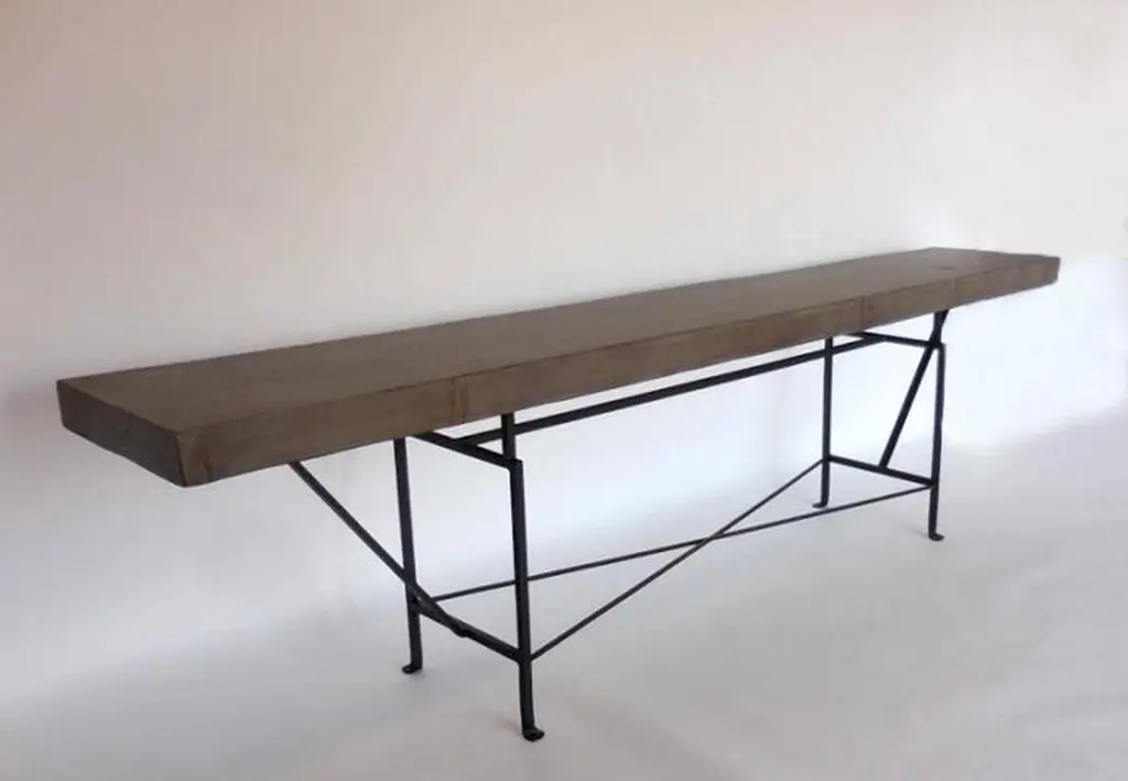 Custom buttress base console. Base is hand-forged iron and top consists of Douglas fir in a custom grey/beige finish. Can be made in any size and in a variety of custom colors/finishes. Dos Gallos Studio. Made in Los Angeles.ALL DOUGLAS FIR PRODUCTS ARE NOW BEING MADE IN CATHEDRAL OAKPRICES ARE SUBJECT TO CHANGE. PLEASE INQUIRE BEFORE PLACING AN ORDER. CUSTOM ORDERS ARE NON RETURNABLE. FINAL SALE