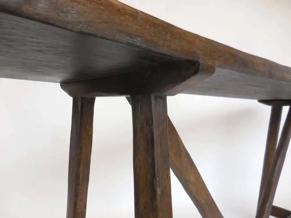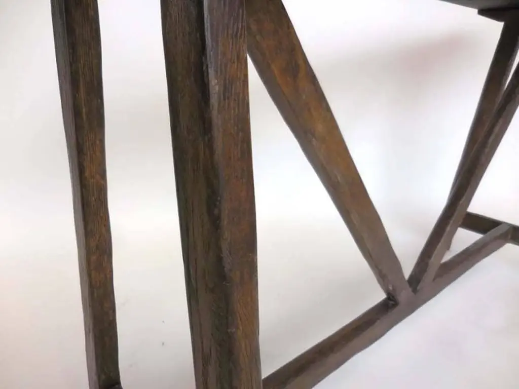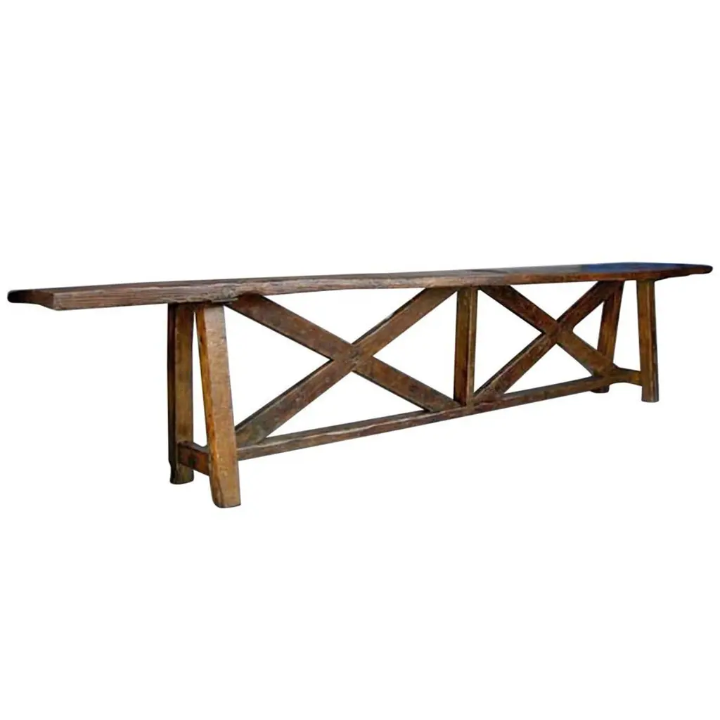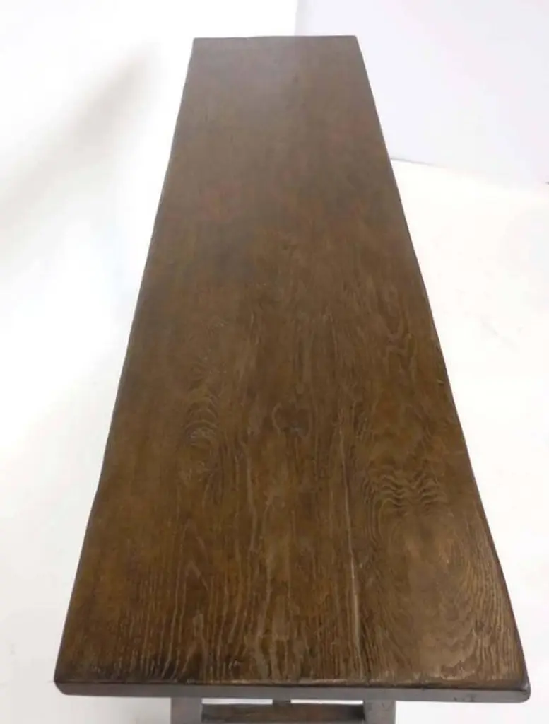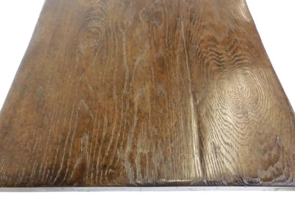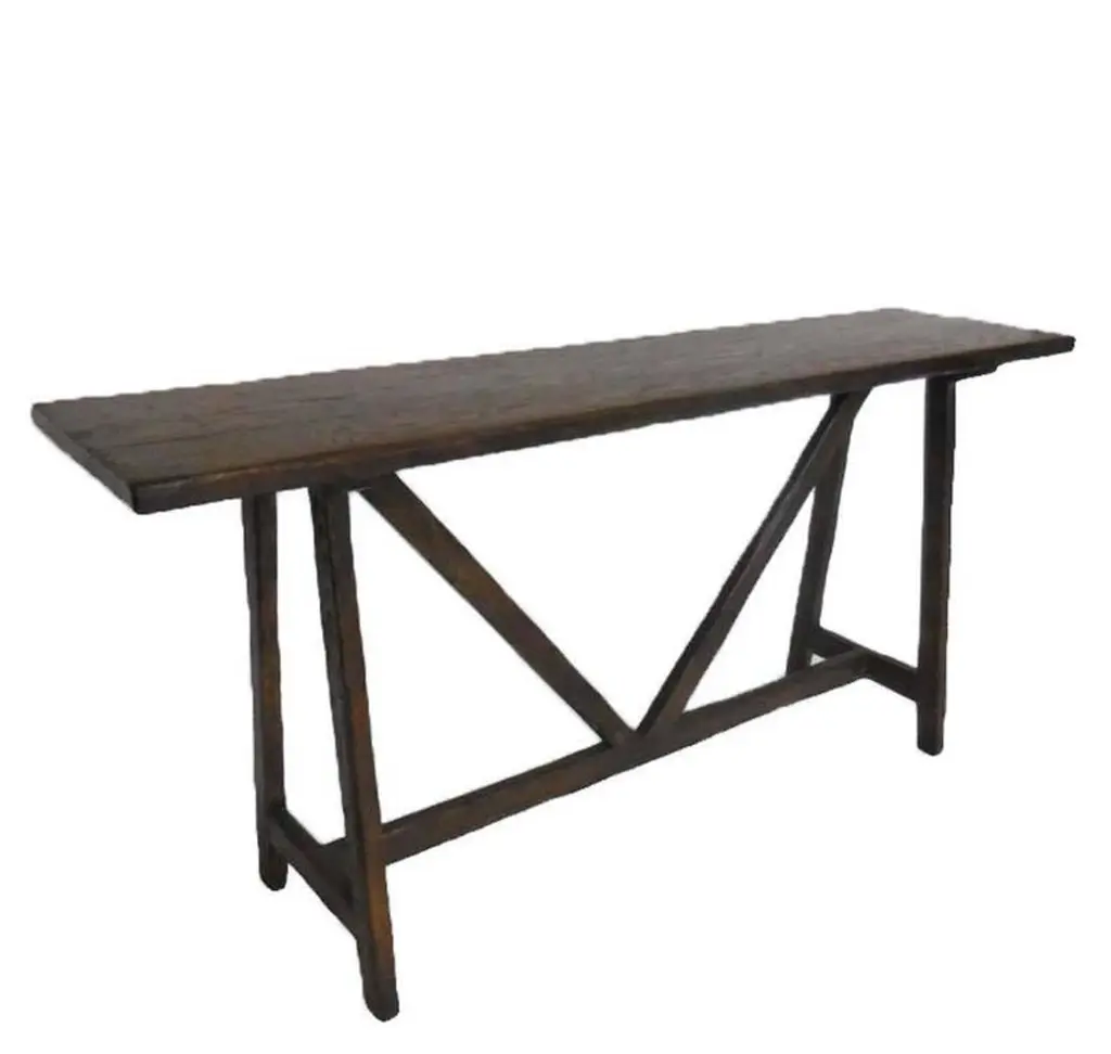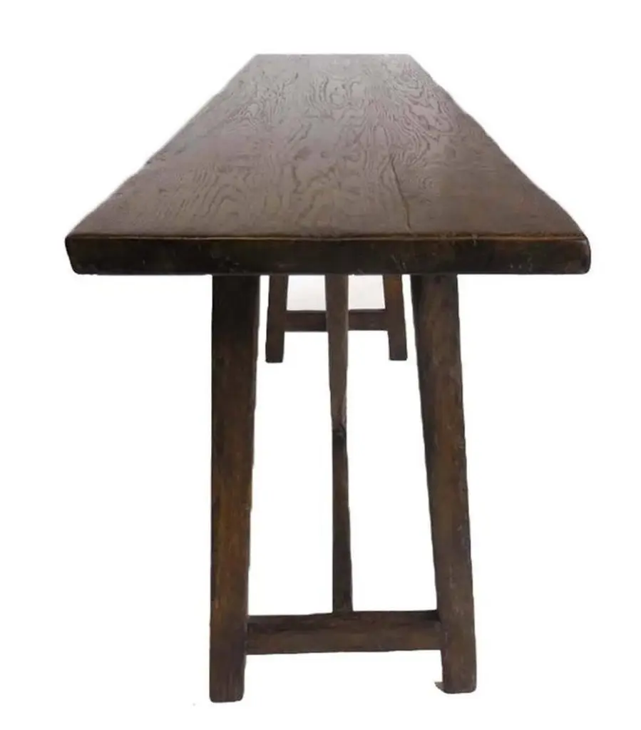 Custom Oak V console with open grain and medium distress and medium dark oak finish. Can be made in any size and finish, in oak, mahogany or walnut. Regular lead time is 12 weeks. Made in Los Angeles by Dos Gallos Studio.PRICES ARE SUBJECT TO CHANGE. PLEASE INQUIRE BEFORE PLACING AN ORDER. CUSTOM ORDERS ARE NON RETURNABLE. FINAL SALE