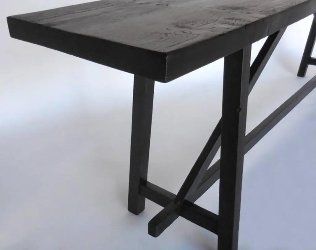 Custom console or sofa back able in reclaimed wood As shown here in espresso finish. Natural distress of old wood. Can be made in any size and in a variety of finishes, and with different stretcher configurations. Made in Los Angeles by Dos Gallos Studio.PRICES ARE SUBJECT TO CHANGE. PLEASE INQUIRE BEFORE PLACING AN ORDER. CUSTOM ORDERS ARE NON RETURNABLE. FINAL SALE