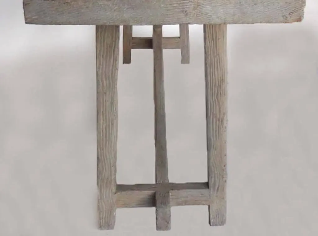 Weathered, driftwood finish console in reclaimed douglas fir with X stretcher with a hand-forged iron mariposa (butterfly). Can be made custom in any size and in a variety of finishes. Made in Los Angeles by Dos Gallos Studio.ALL DOUGLAS FIR PRODUCTS ARE NOW BEING MADE IN CATHEDRAL OAKPRICES ARE SUBJECT TO CHANGE. PLEASE INQUIRE BEFORE PLACING AN ORDER. CUSTOM ORDERS ARE NON RETURNABLE. FINAL SALE