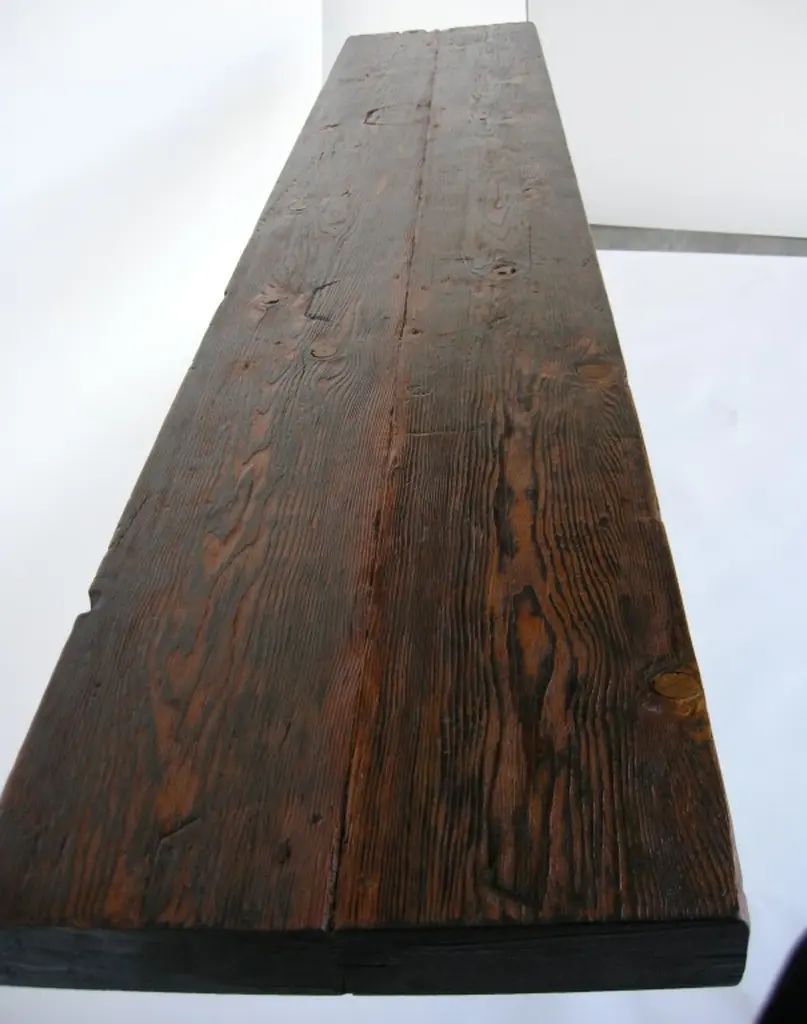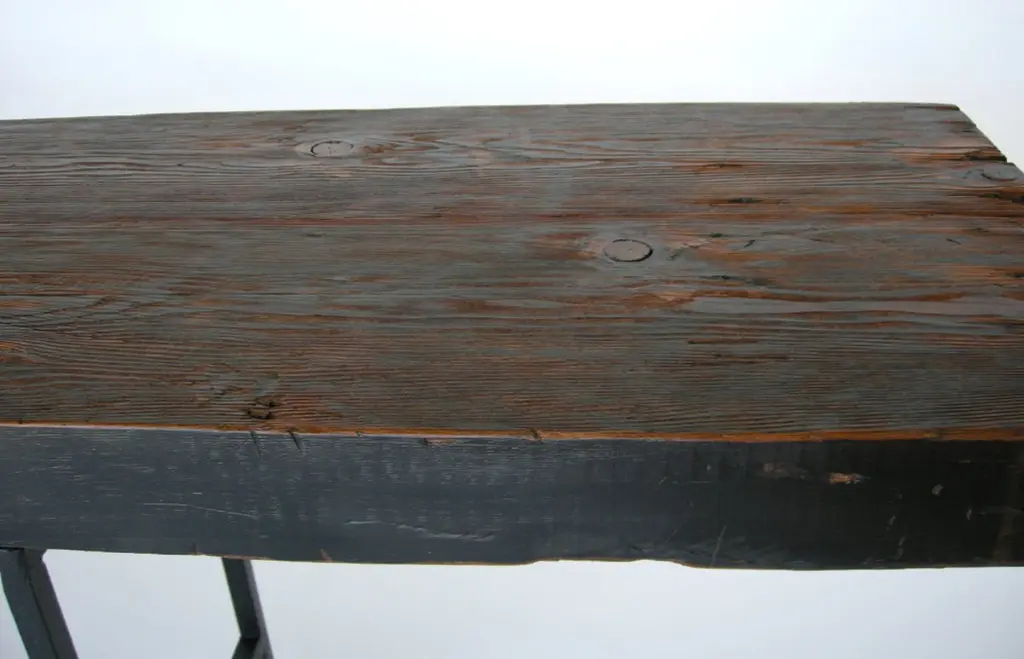 Wood console with hand forged base. Shown here in a built up top in Douglas fir, approximately 3.5" thick. Can be made in Oak , Walnut or Douglas fir. be made in custom sizes. Made in Los Angeles by Dos Gallos studio.ALL DOUGLAS FIR PRODUCTS ARE NOW BEING MADE IN CATHEDRAL OAK CUSTOM PRICES ARE SUBJECT TO CHANGE DUE TO FLUCTUATING WOOD AND LABOR PRICES. PLEASE INQUIRE BEFORE PLACING AN ORDER.CUSTOM ORDERS ARE NON RETURNABLE. FINAL SALE