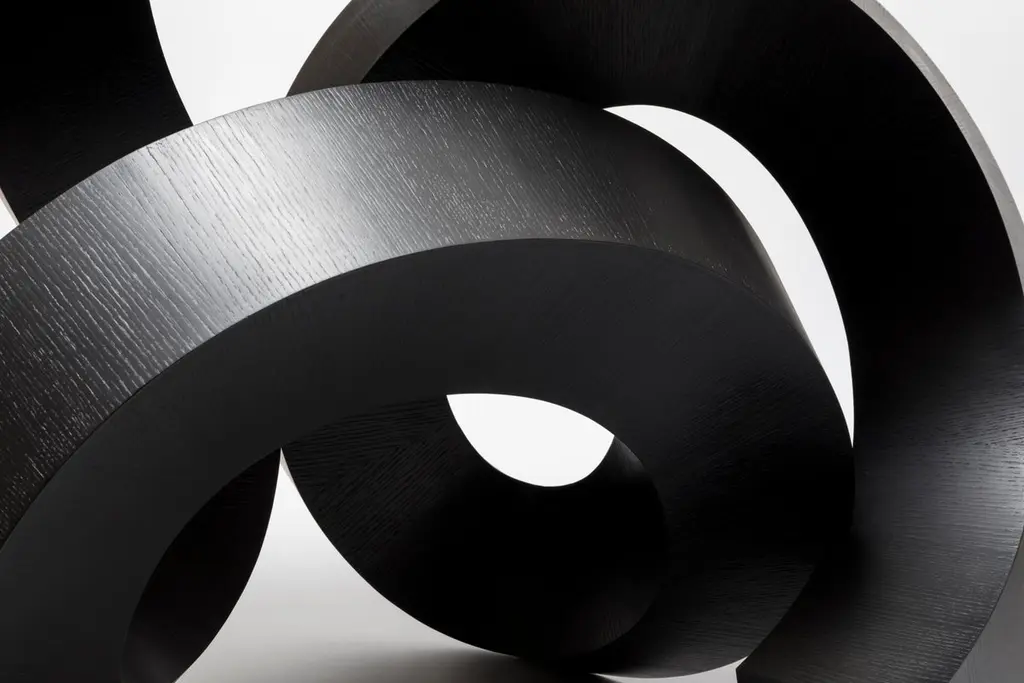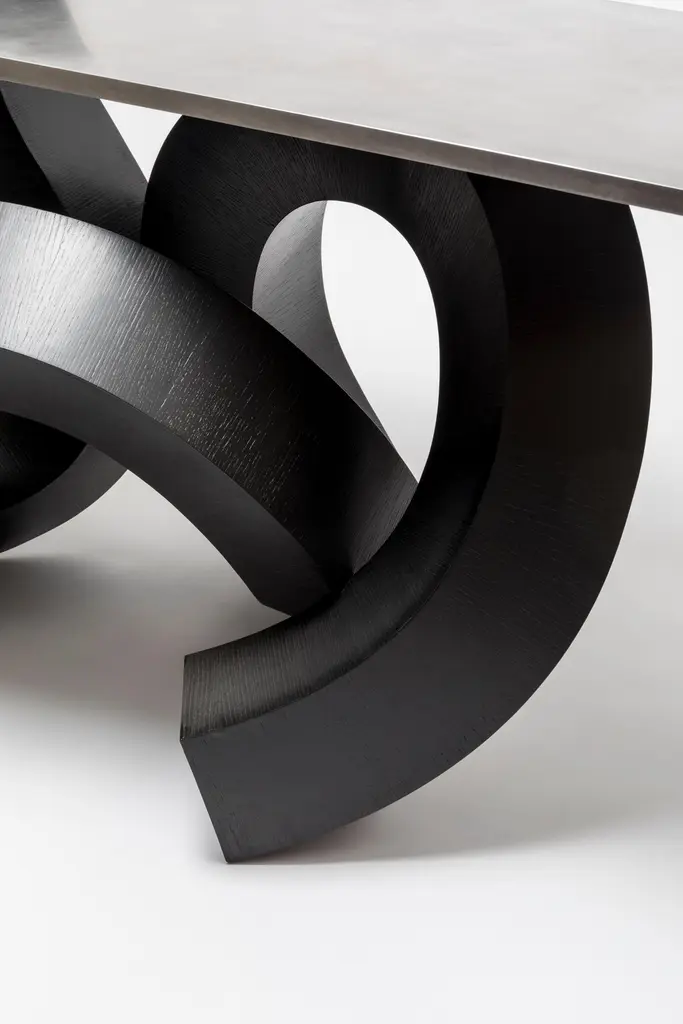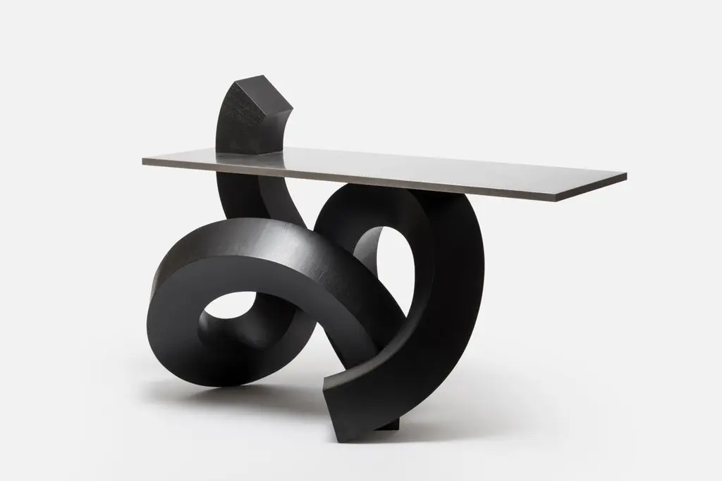Caoshu (known as Chinese cursive brush-writing) is the most abbreviated typeface in the calligraphy. The free flow resembles the appearance of a dragon that seems to fly through the sky. Chulan Kwak, inspired by this movement, restructured the 2D stroke of Caoshu, which seemed to run the blank space rhythmically, into the 3D structure. He has created ‘Cursive Structure’ that functions as well as creating a contrast between the object and margin of space that changes according to the viewpoint.In order to realize this free curved form, Chulan Kwak applied the technique of paper craft to woodwork. He first created the form through 3D software and then unfolded it to extract the accurate drawing. He used this method to precisely cut thin and bendable plywood with a CNC machine and to adhere the edges of each parts correctly in order. Through the combination of the digital tool and craftsmanship, he was able to create the solid forms of free curves in the real world, such as those made in the virtual space. They were finished after dyeing with Muck(ink used for Chinese brush-writing) for the deep black color.