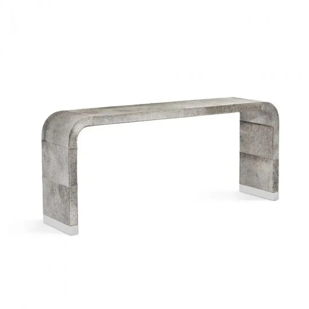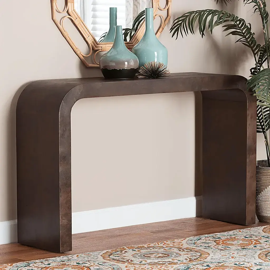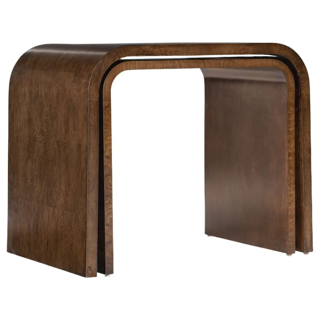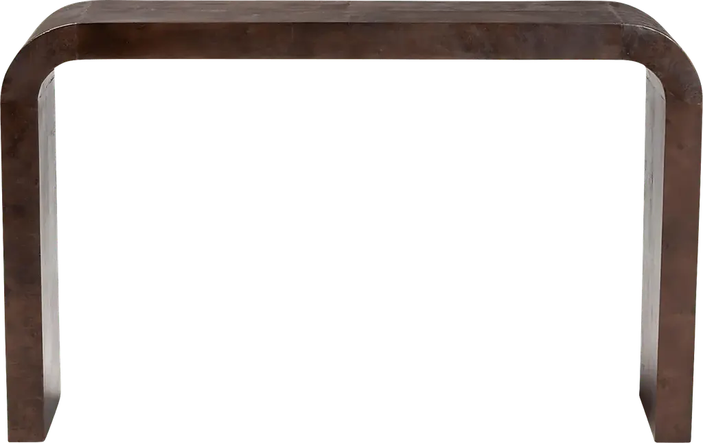 Incorporate the beauty of the natural world in your household with the stunning Driftfruit dark brown console table. This modern piece consists of natural burl wood. Its wide tabletop serves a fantastic display area while its smooth silhouette blends seamlessly with any modern layout. The Driftfruit will arrive fully assembled and showcases the rich knots and rolling grain unique to burl wood, resulting in no two pieces being exactly alike.