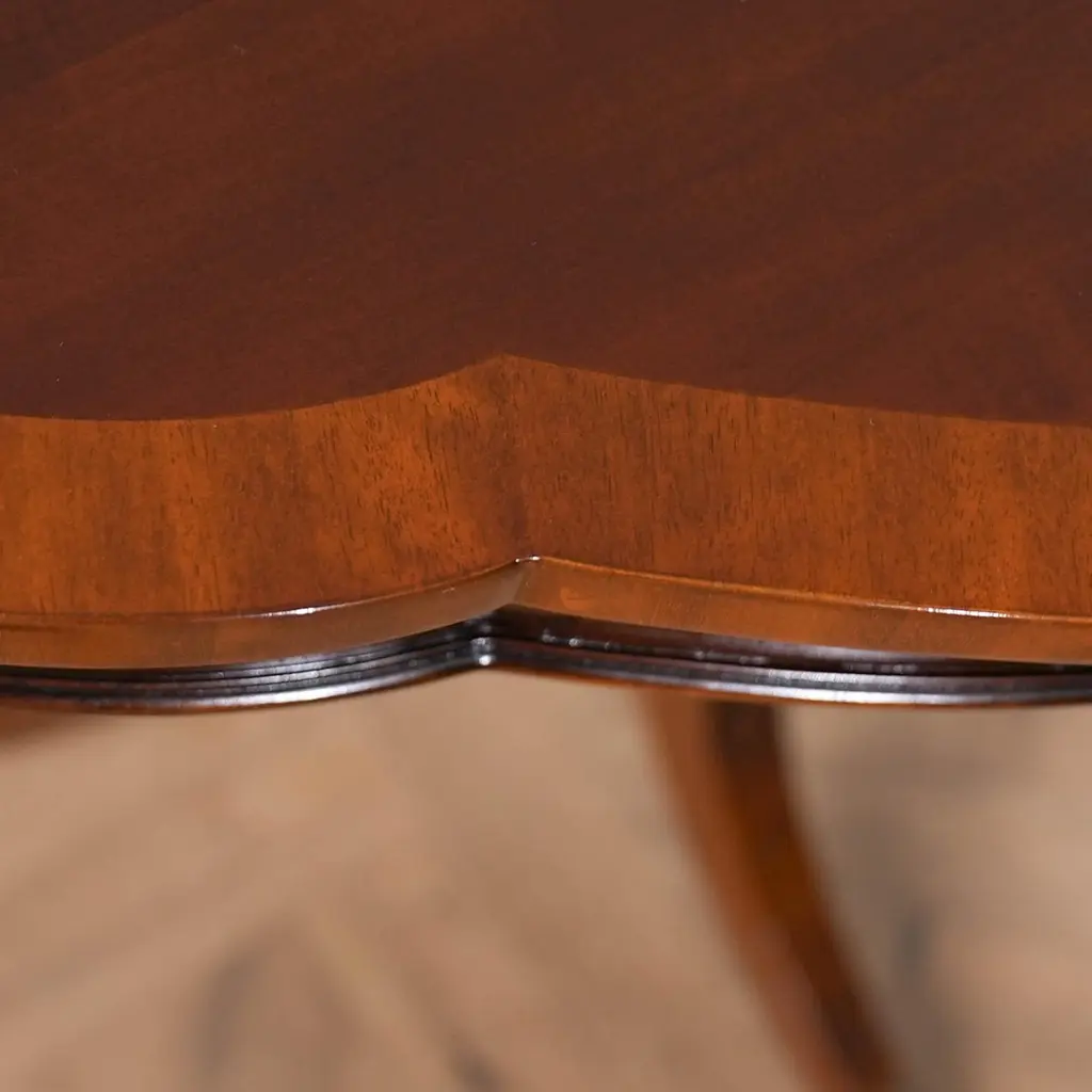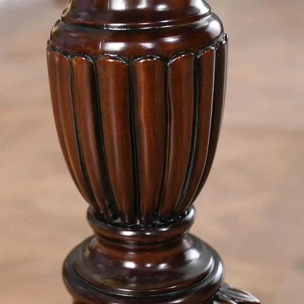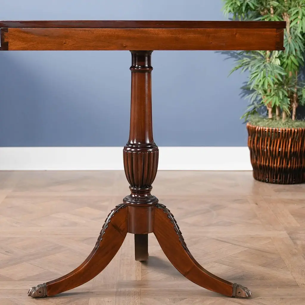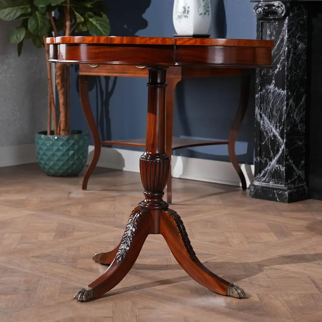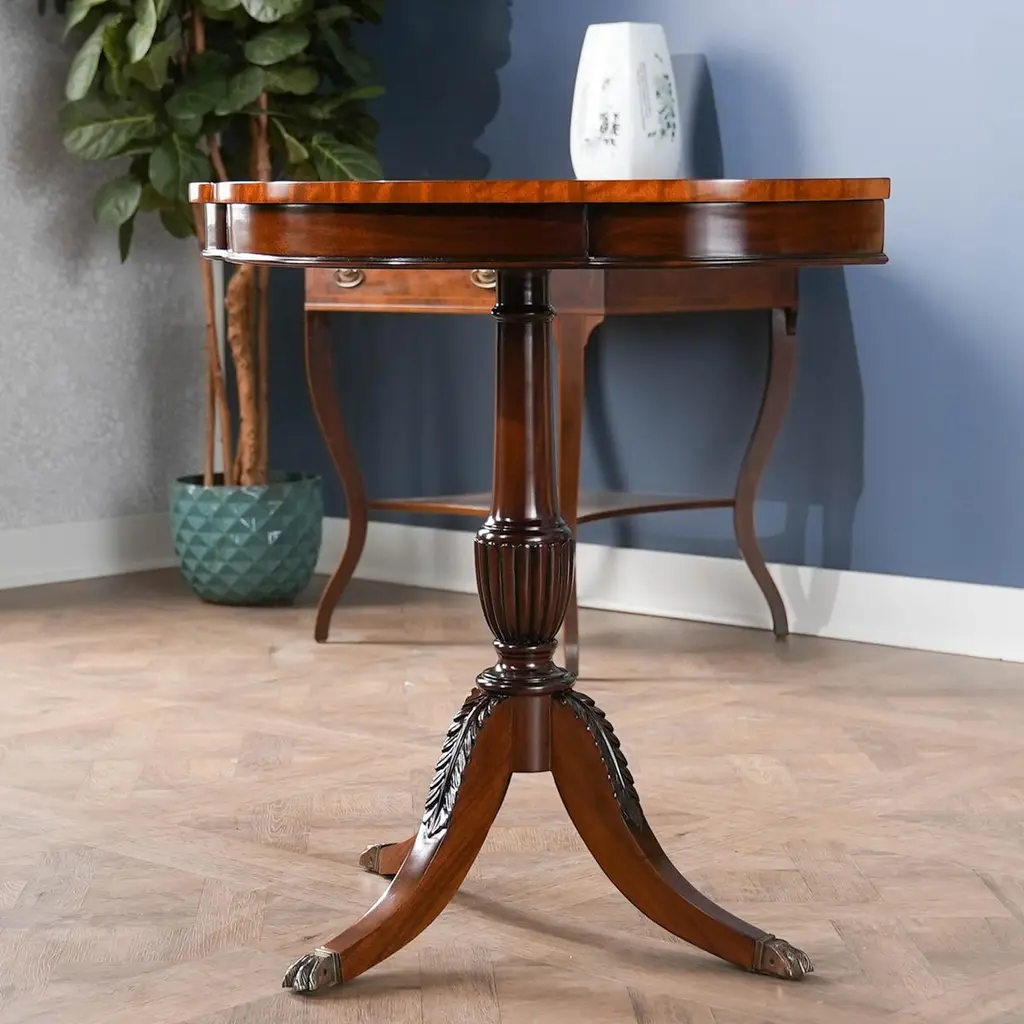 A great value this high quality Duncan Phyfe Console has made the top sellers list for years. Based on an antique design our reproduction console features a shaped mahogany top with satinwood banding is fastened on a central column with three hand carved legs sweeping out towards the brass capped feet. Hand carved solid mahogany base and legs.Measures 31″w x 17″d x 29″h metric 79 43 74