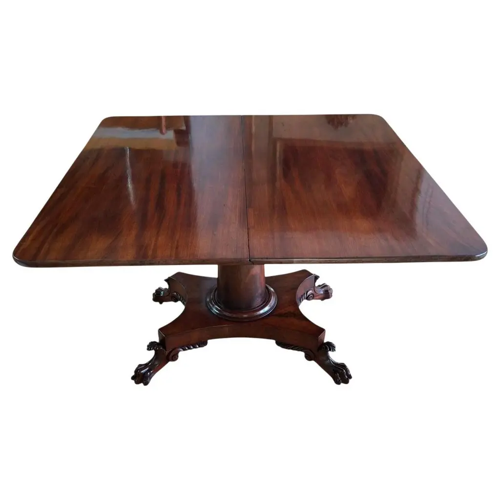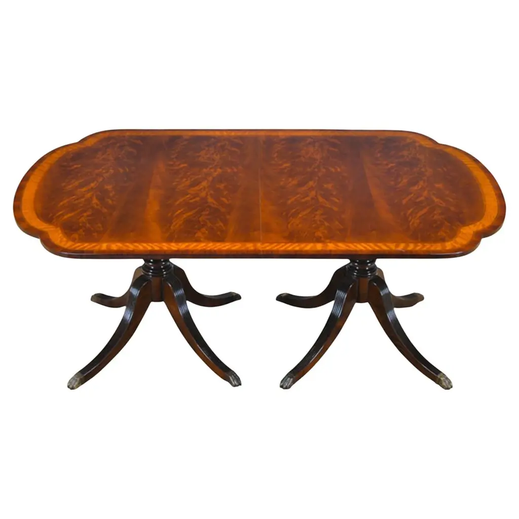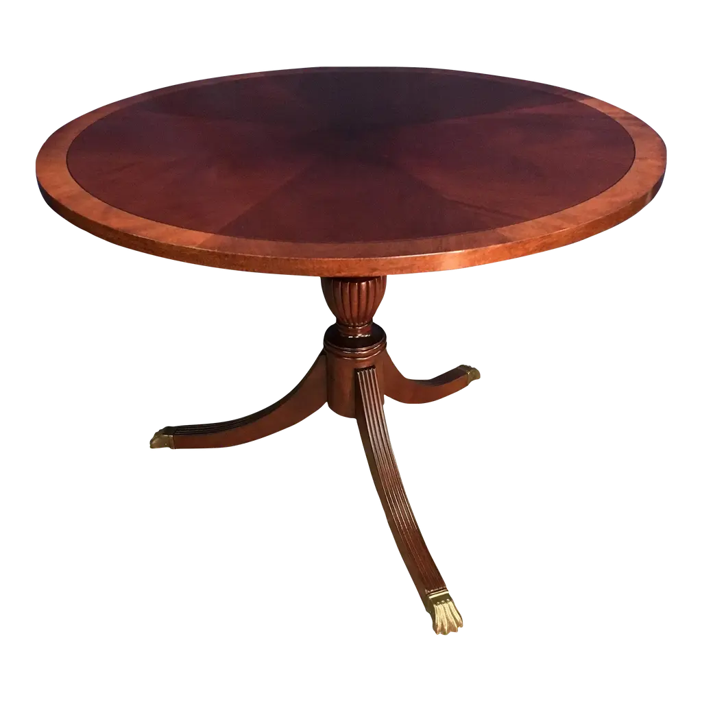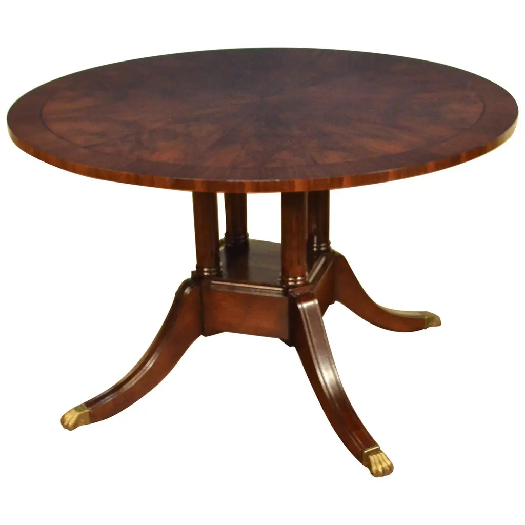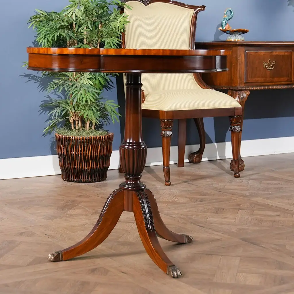 A great value this high quality Duncan Phyfe Console has made the top sellers list for years. Based on an antique design our reproduction console features a shaped mahogany top with satinwood banding is fastened on a central column with three hand carved legs sweeping out towards the brass capped feet. Hand carved solid mahogany base and legs.Measures 31″w x 17″d x 29″h metric 79 43 74