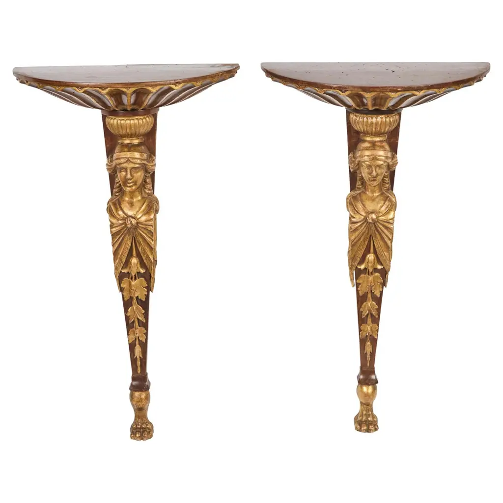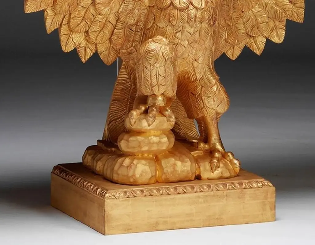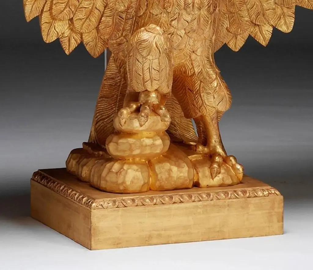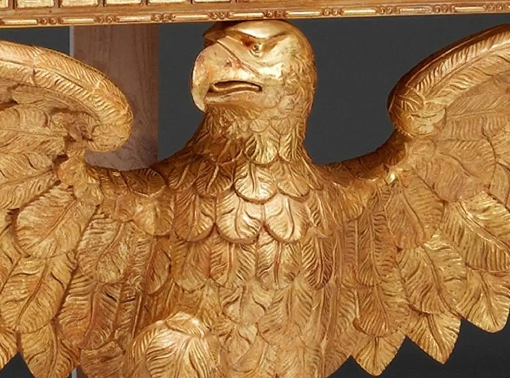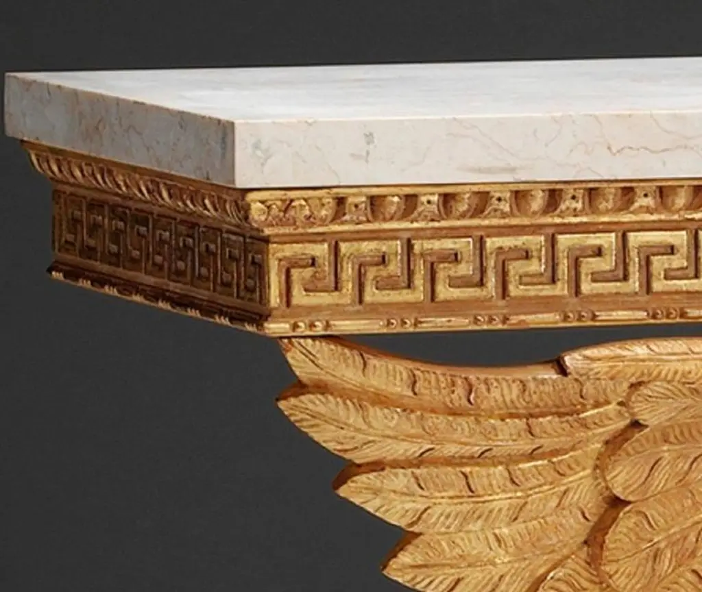 A pair of carved giltwood console tables in the style of William Kent and the reign of George II. The marble tops rest above the egg and dart and Greek key pattern moulded friezes. The naturalistically carved eagles, with outstretched wings, Stand on a rockwork bases and are raised on a carved and moulded plinths.We are currently working to a 30-36 week lead time.