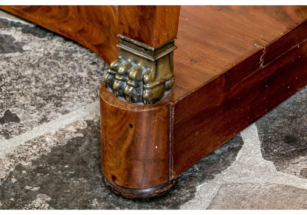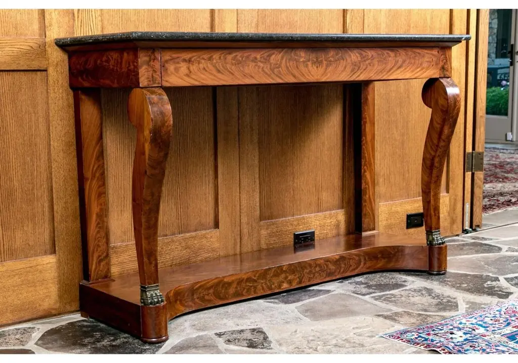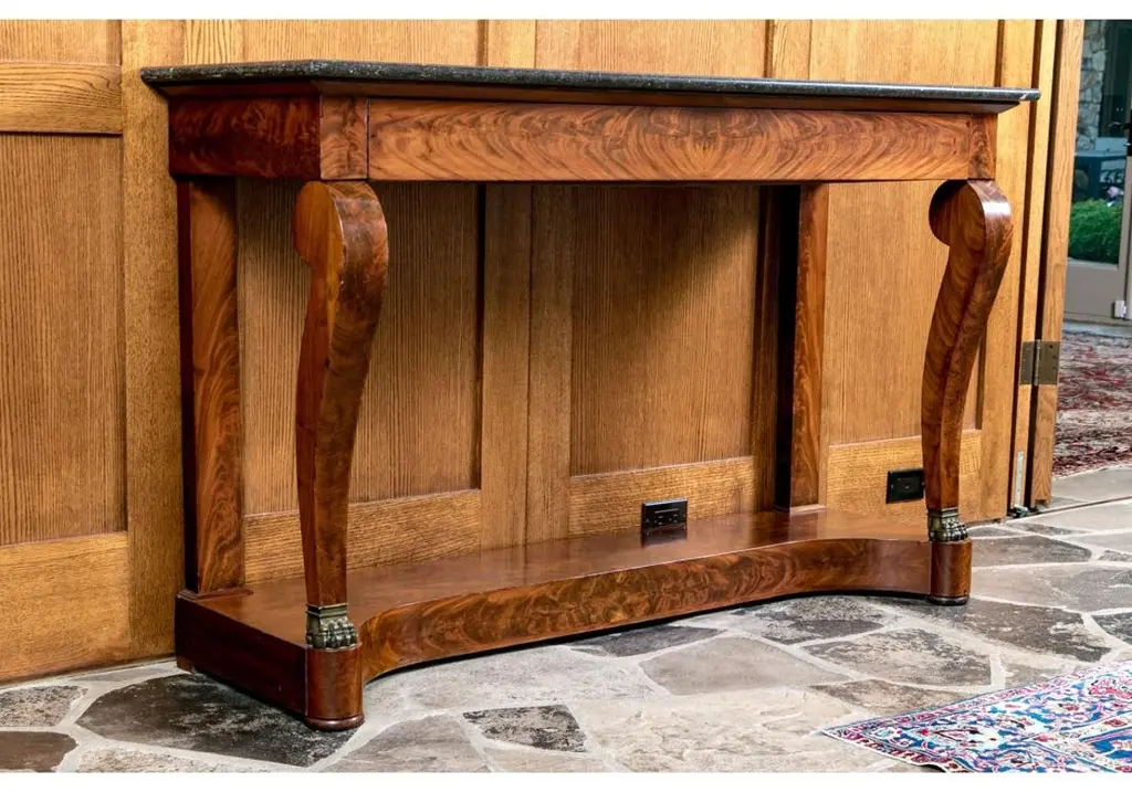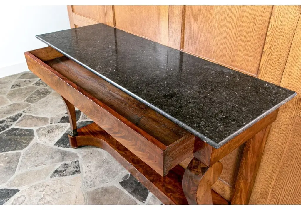 An exceptional antique French first empire marble-topped figured mahogany console table, circa 1800. The rectangular Belgian black-gray flecked marble top surmounts a conforming frieze with a long drawer, without hardware, the handholds underneath. Supported by front scrolled legs with gilt-metal paw caps, the rear legs are rectangular and molded at the bottom. All raised on an incurved serpentine platform stretcher base with swelled ends, suppressed disk feet in front, and suppressed square feet in back. Provenance: Escabelle Imports, Ltd./French Antiques, New York, NY. June 1997.Dimensions: 60" L, 20 1/4" D and 38" HCondition: Please see detail photos. There are some expected and acceptable light scratches to the stone top as well as a few sporadic nicks to the frame edges mentioned for accuracy as the presentation is, as stated, exceptional.