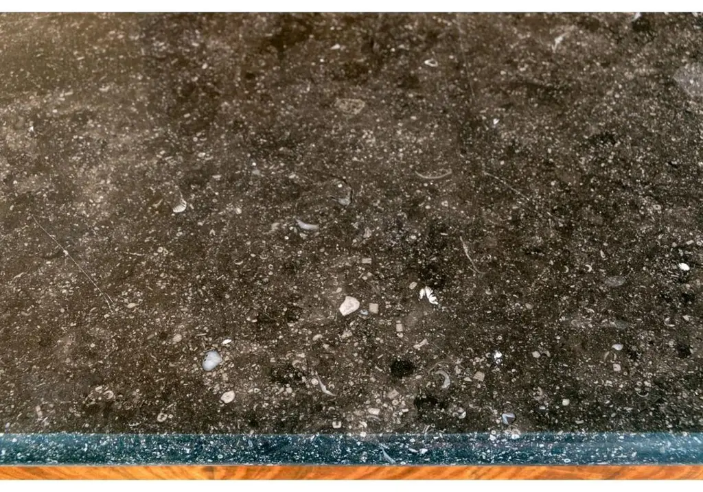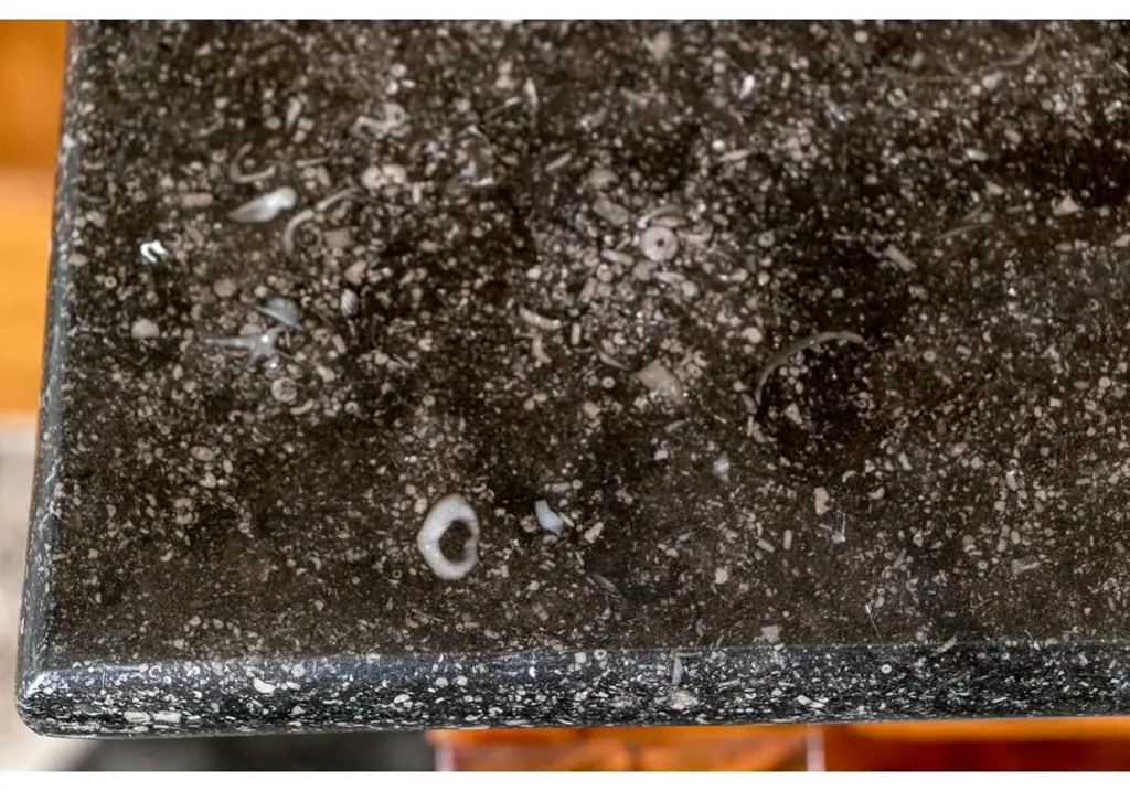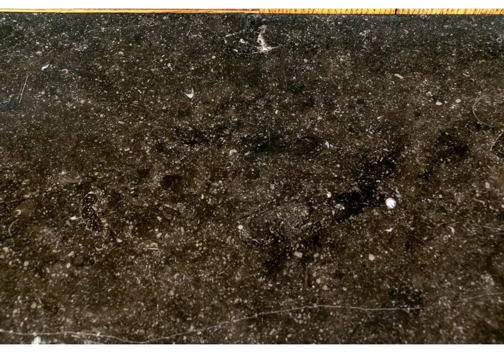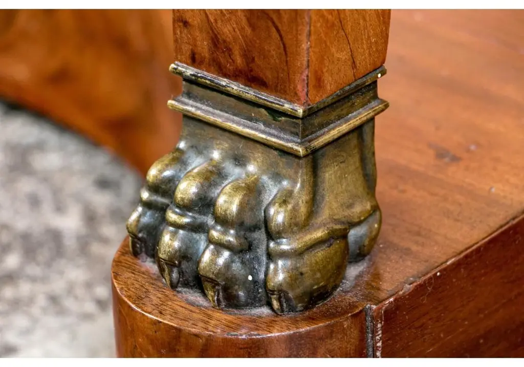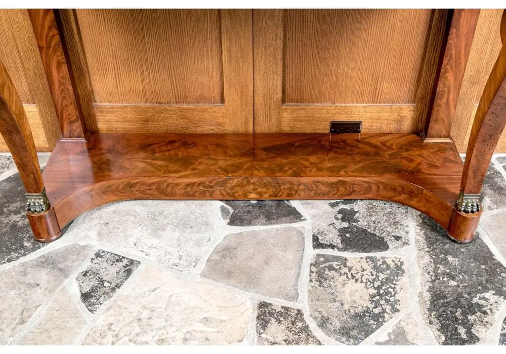 An exceptional antique French first empire marble-topped figured mahogany console table, circa 1800. The rectangular Belgian black-gray flecked marble top surmounts a conforming frieze with a long drawer, without hardware, the handholds underneath. Supported by front scrolled legs with gilt-metal paw caps, the rear legs are rectangular and molded at the bottom. All raised on an incurved serpentine platform stretcher base with swelled ends, suppressed disk feet in front, and suppressed square feet in back. Provenance: Escabelle Imports, Ltd./French Antiques, New York, NY. June 1997.Dimensions: 60" L, 20 1/4" D and 38" HCondition: Please see detail photos. There are some expected and acceptable light scratches to the stone top as well as a few sporadic nicks to the frame edges mentioned for accuracy as the presentation is, as stated, exceptional.