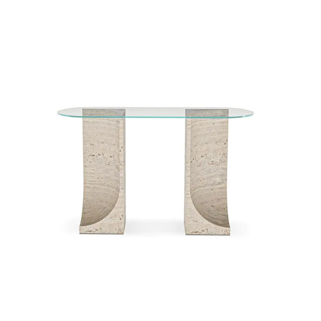 Edge console by CollectorDimensions: W 130 x D 45 x H 80 cmMaterials: glass, travertinoOther materials available.The Collector brand aims to be part of the daily life by fusing furniture to our home routine and lifestyle, that’s why we’ve designed our pieces with the intention to embrace diverse styles and to blend in inside anycontemporary setting.Described by our motto: “built to fit a good IDEA.”, this wide range of product typologies were designed to work in diverse layers of importance. It can work as a center piece of the house, with strong personality or just complementing the background by gently blending in. The result is a clean-lined furnishing collection that can easily be customized to work specifically and according to each unique need, reflecting essentially our traditional methods of furniture manufacturing with accurate Industrial Production methods.We strive to achieve the best quality possible by selecting the best materials and by the constant development of our production processes and manufacturing partnerships.