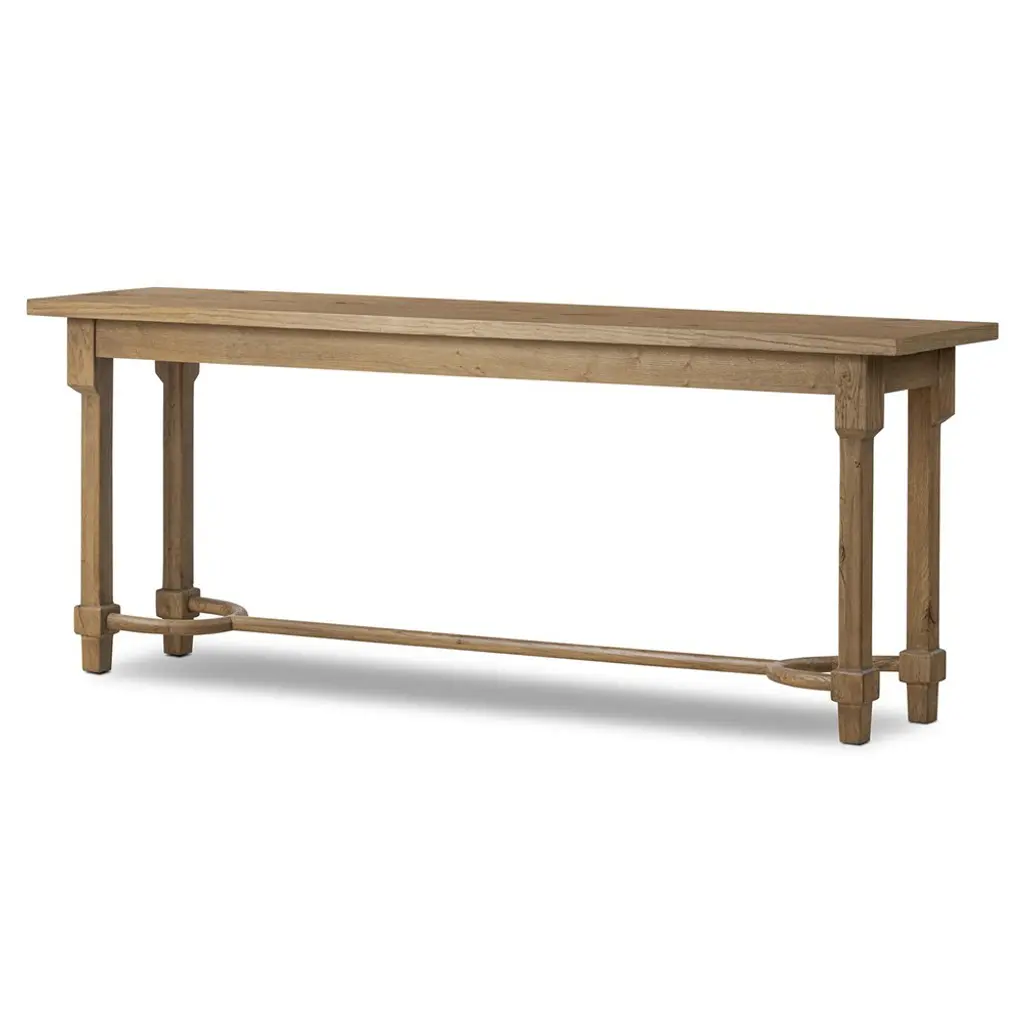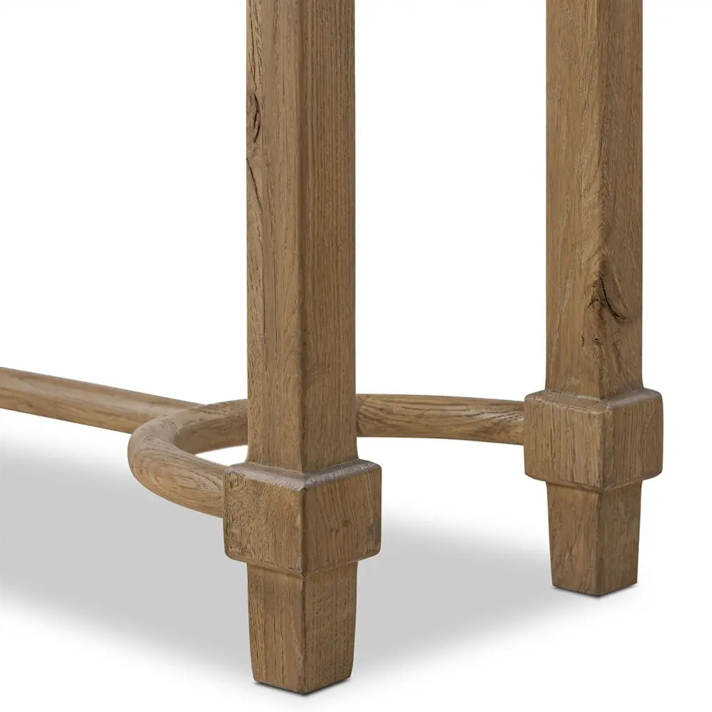 A design collaboration by Amber Lewis and Four Hands. An antique-inspired console table of worn oak features natural knots and graining for a storied look with character.