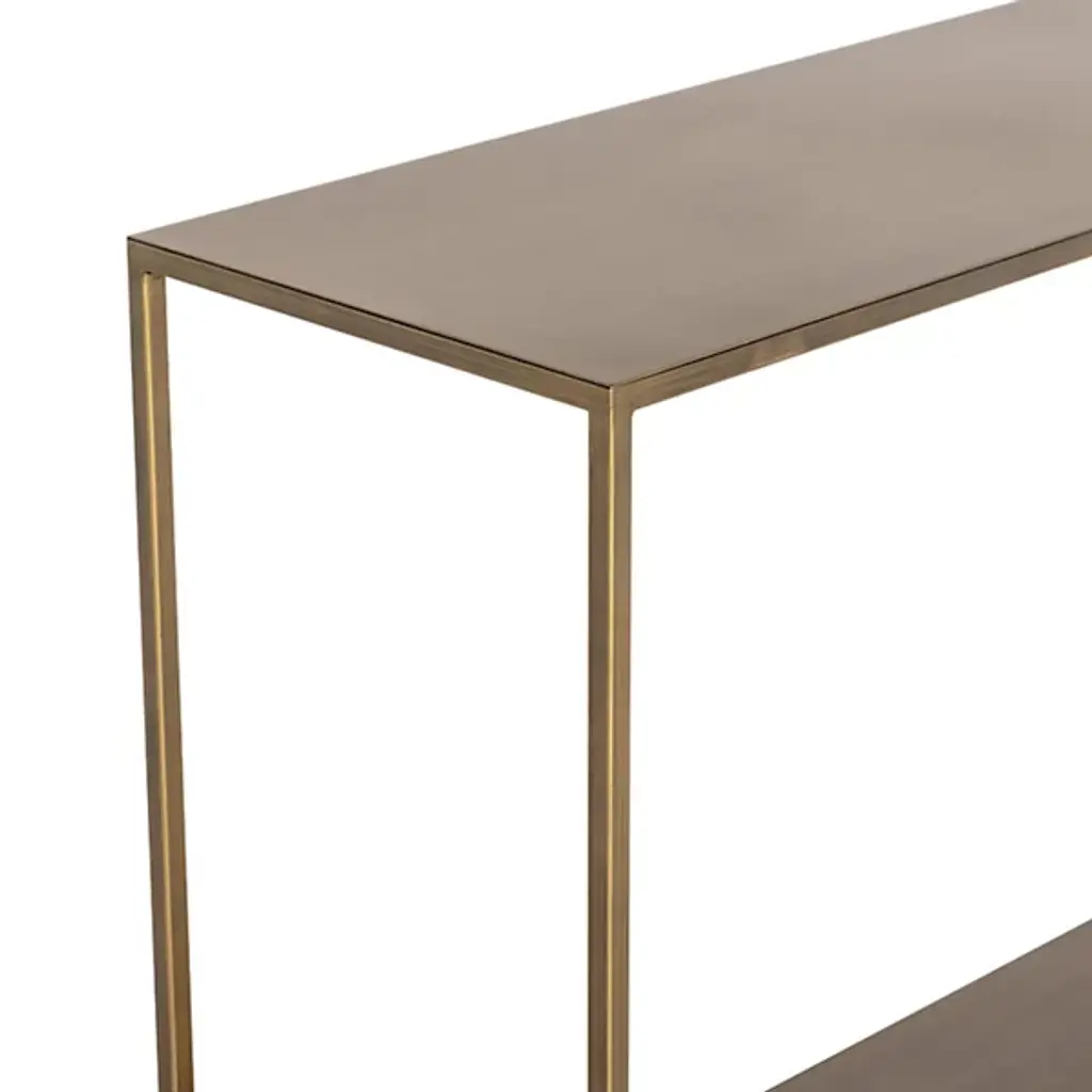 The Eiffel Console Table from Sunpan brings sophisticated storage to any space. Made from black powder-coated iron, its minimalist design suspends two slender shelves between three tall bracket bases, offering ample versatility. Great if situated behind a sofa, in an entryway, or along a hallway, this table combines an open construction with fabulous functionality. The open design, ample storage, streamlined silhouette, and artisanal finish make it a standout piece for contemporary and mid-century modern interiors.