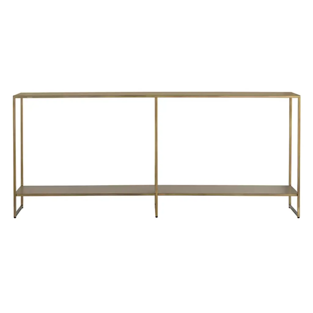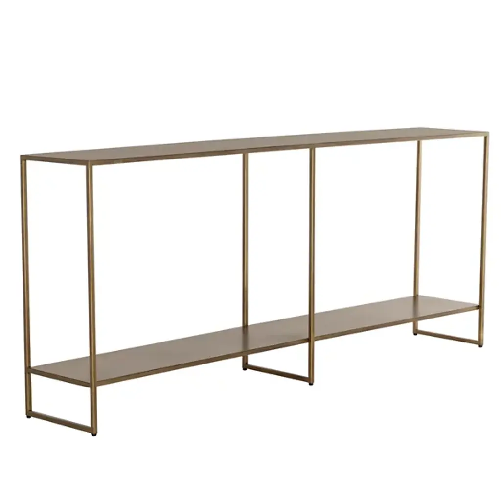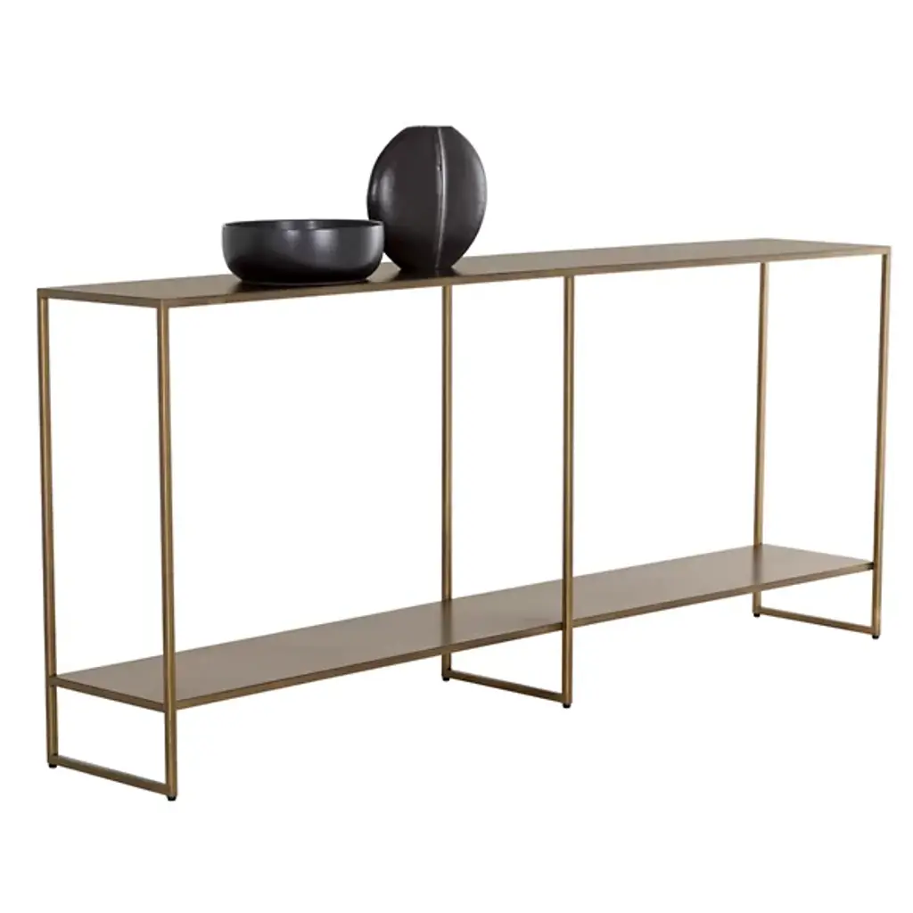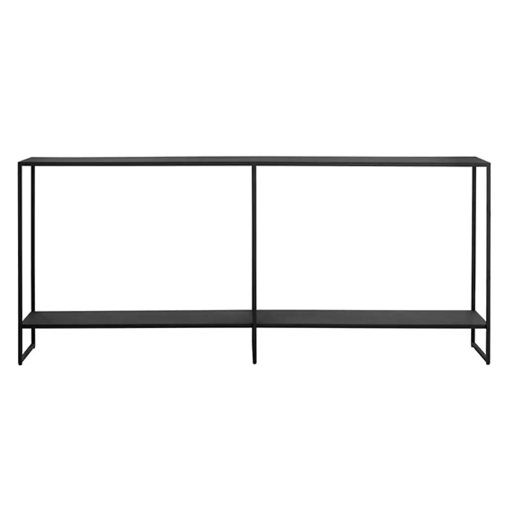 The Eiffel Console Table from Sunpan brings sophisticated storage to any space. Made from black powder-coated iron, its minimalist design suspends two slender shelves between three tall bracket bases, offering ample versatility. Great if situated behind a sofa, in an entryway, or along a hallway, this table combines an open construction with fabulous functionality. The open design, ample storage, streamlined silhouette, and artisanal finish make it a standout piece for contemporary and mid-century modern interiors.