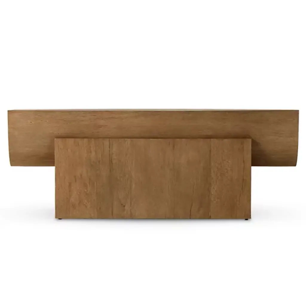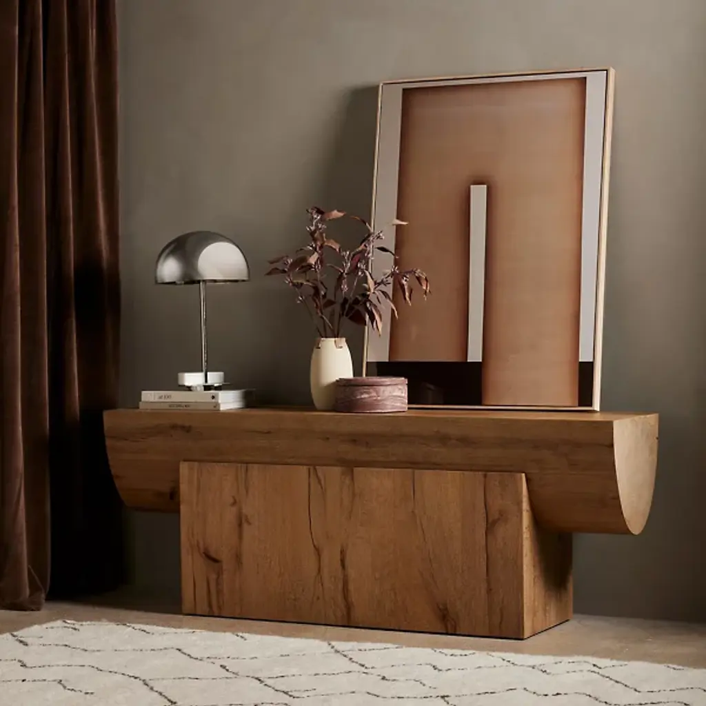 The Elbert Console Table from Four Hands intersects geometric simplicity with rustic character. Featuring a flat-topped half-cylinder top set sideways within a sturdy rectangular base, this table adds a sculptural presentation to any space. Made with thick oak veneer and ash oyster veneer, it exudes natural warmth and sophistication. The shape is great for entryways or accompanying living rooms, not only providing functional surface area and artistic charm sure to enhance your home's aesthetic.