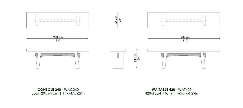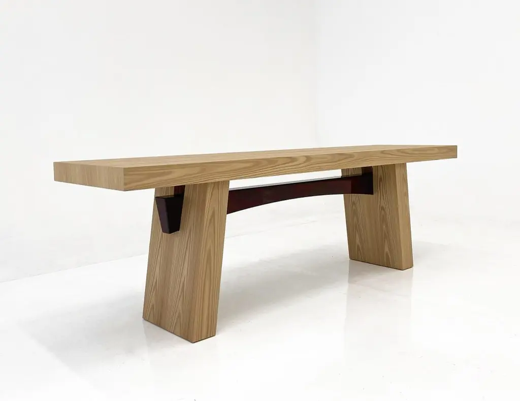 A console of generous proportions with a distinctly thick top and angled legs. Its sleek design is enhanced and enriched by the curve of its contrasting lacquered beam.Finished in Elm wood, with a dark-red gloss-lacquered beam, the WA console it is a piece that does not go unnoticed. In the linearity of the shapes and in the choice of natural materials, the WA console is inspired by the Japanese tradition, to which the name also refers. In fact the word WA evokes the concept of harmony and peace.The contrast between the natural wood top and the horizontal support bar creates a particular effect. Note that the beam is available in many different colors of glossy lacquer (also in other colors upon Customer request).But the WA console also has another interesting feature: it is made up of only four elements (a top, two legs and a bar), which can be assembled together in five minutes. With the exception of two metal studs with the brand monogram, used to fix the undertop bar, the assembly of the WA console does not require the use of hardware. The pieces fit into each other thanks to dowels, and the structure is very solid .