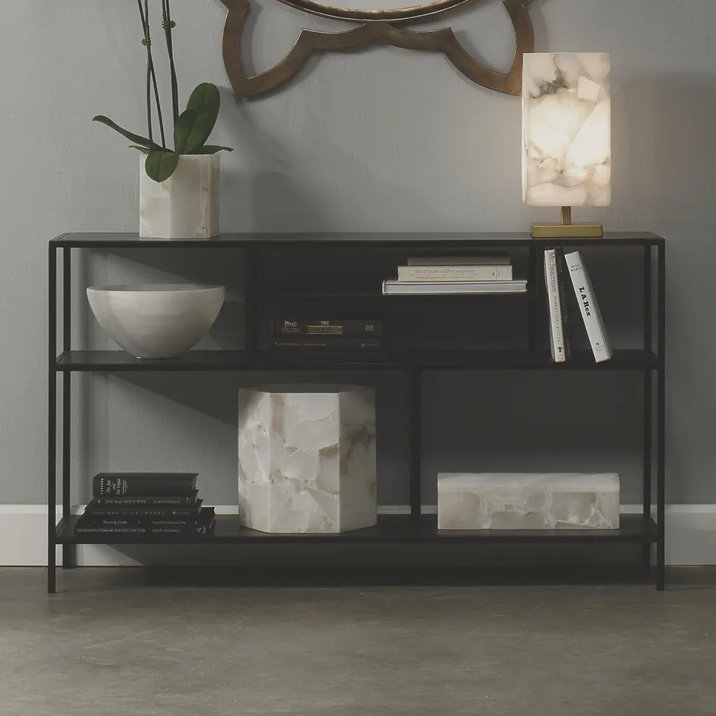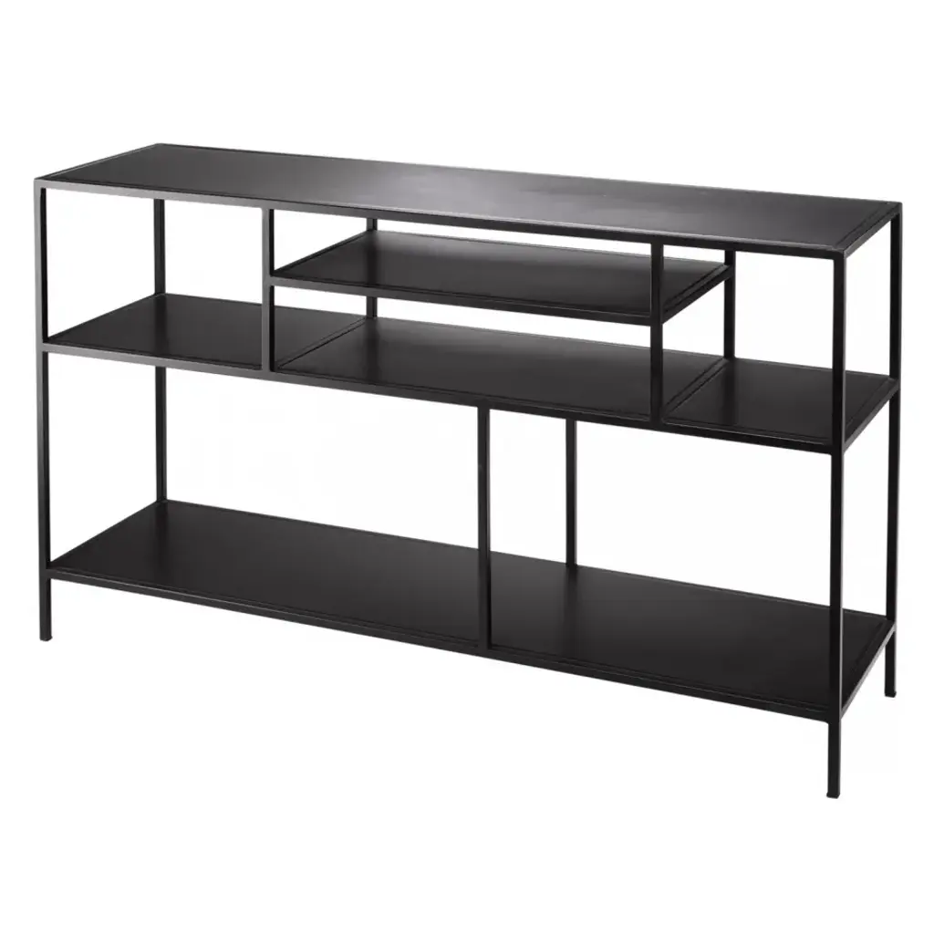 Black metal shelves and supports are asymmetrically arranged to create the perfect console or open-work media cabinet. The extra storage is great for displaying curated accessories or audio/visual necessities.