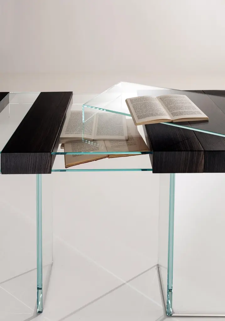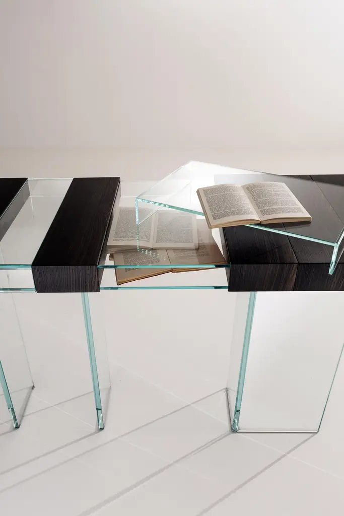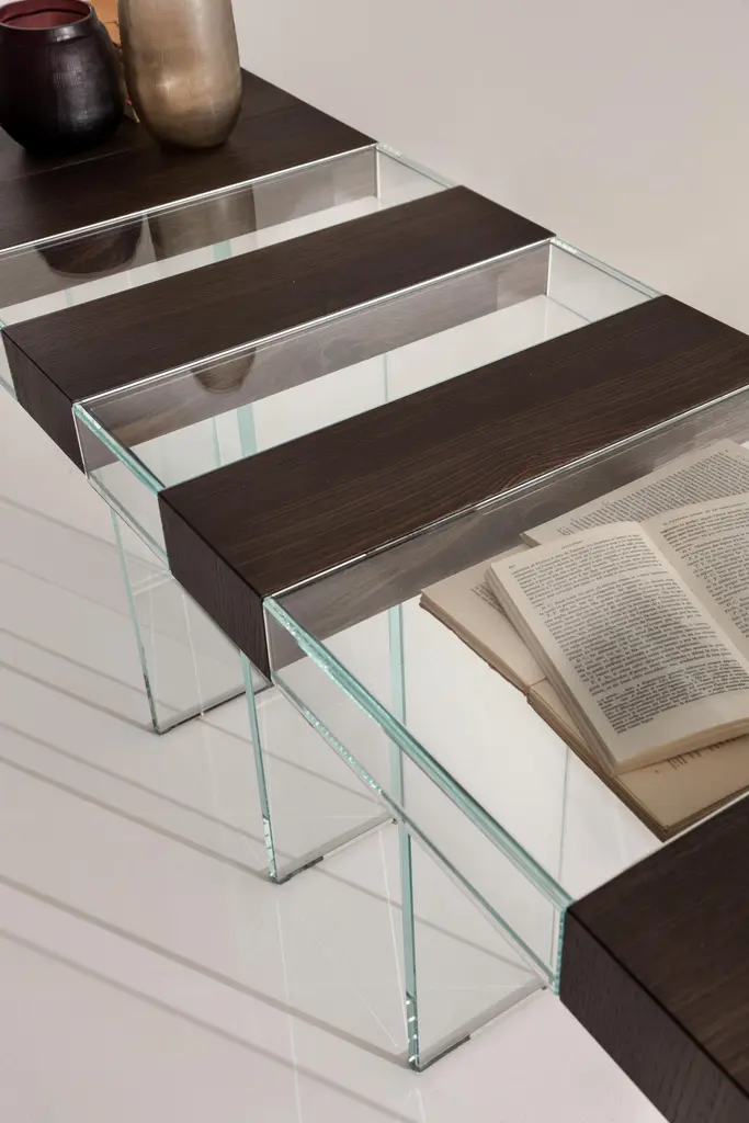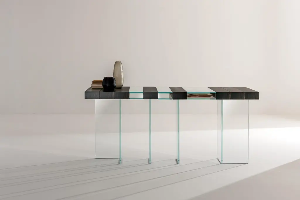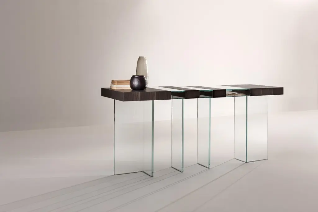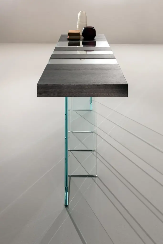Elemento Console Table by LaurameroniDimensions: W 180 x D 50 x H 80 cmMaterials: Stone Oak Tabacco and extra‐clear crystalConsole with modules in Stone Oak wood and openable extra‐clear crystal cases. Extra‐clear crystal legs.Laurameroni:The ability of craftsmen from the Brianza area has fascinated them from a young age. Over time, this craftsmanship has evolved and developed into industrial production. They wanted to invite architects to rediscover and exploit the unique skills of master craftsmen. Their aim was to create products using the most sophisticated equipment and the finest materials, designed for ambitious and refined individuals seeking items where differentiation and uniqueness prevail.