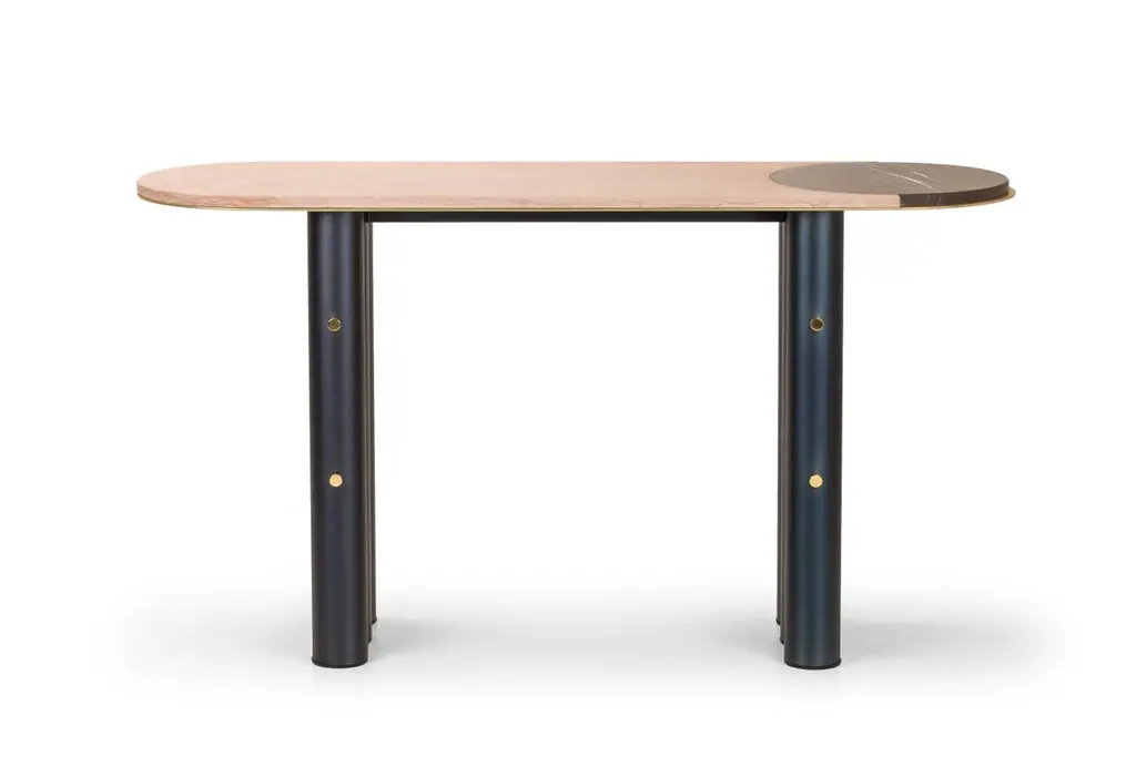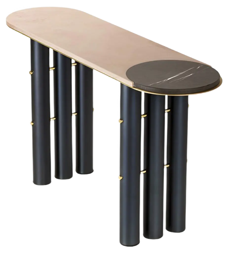 Elephant console by MingardoDimensions: D140 x W40 x H85 cm.Materials: RAL 9005 black varnished iron structure, top in marble (black marquina and pink granite), brass details.Weight: 95 kgAlso Available in different finishes. The Elephant console is made of geometric elements that, assembled together, generate a product of unusual proportions. The shimmering blue galvanic finishing with brass reflections of the legs, and the pink and black marble of the top, give the console a sophisticated yet informal look.Mingardo Ilario founded Mingardo Blacksmith Workshop in 1970, after over twenty years’ experience in the metal processing field.The production was initially focused on simple blacksmith works for the construction industry. Over the time, it has become more refined, enabling the company to collaborate with internationally renowned companies and architects: from the first collaborations with architect Carlo Scarpa to the more recent commissions for Museo del Novecento in Milan, Parco della Musica in Florence, and Teatro Petruzzelli in Bari.Over the years, the Workshop has achieved great results, with the production of unique metal products, all hand-wrought by a highly skilled team of specialized artisans. Nowadays, it is highly regarded in the local artisan field for its high-end refined finishing touches and details, and for its know-how.