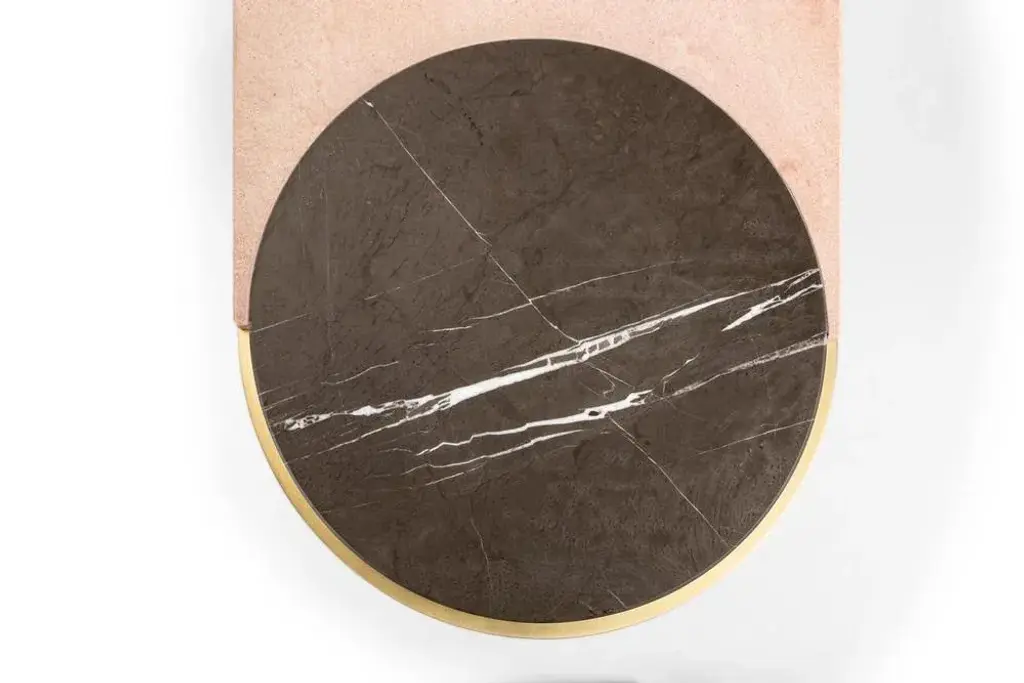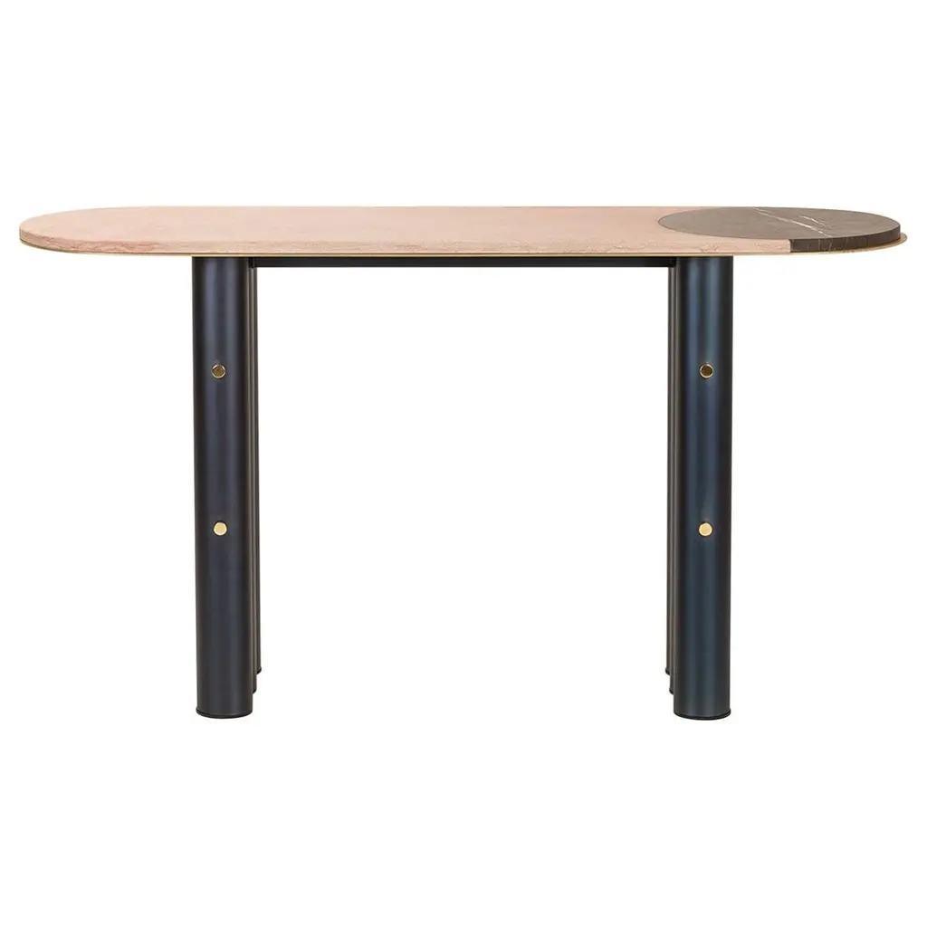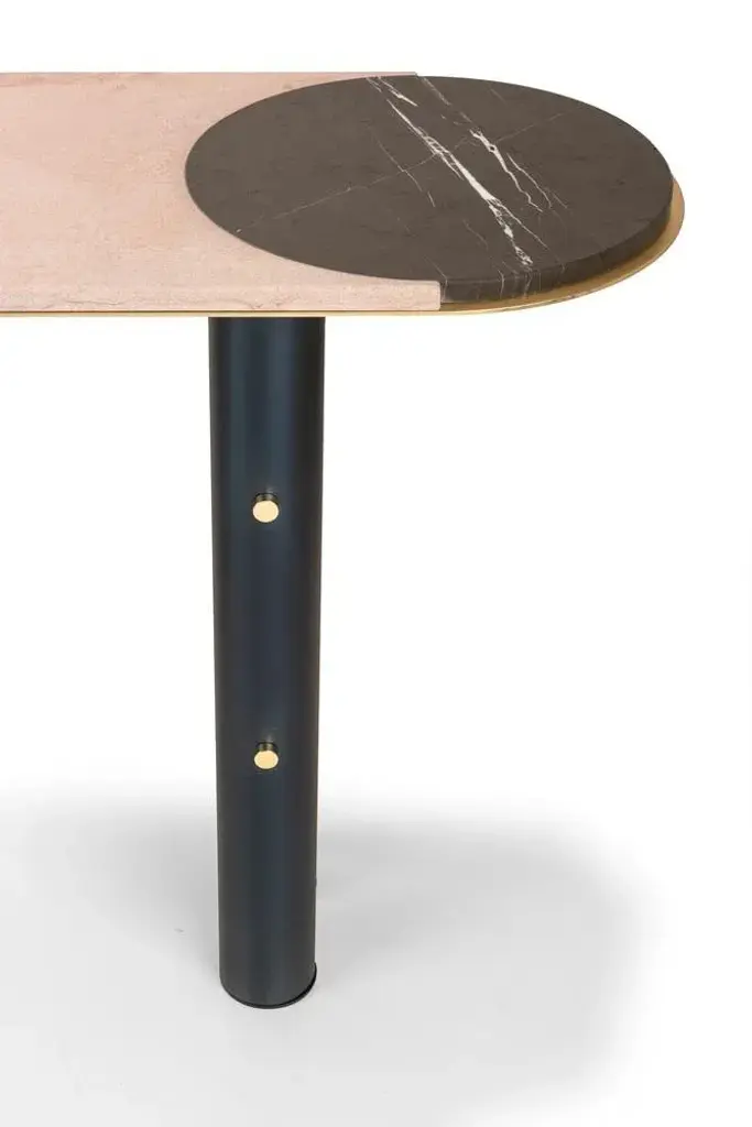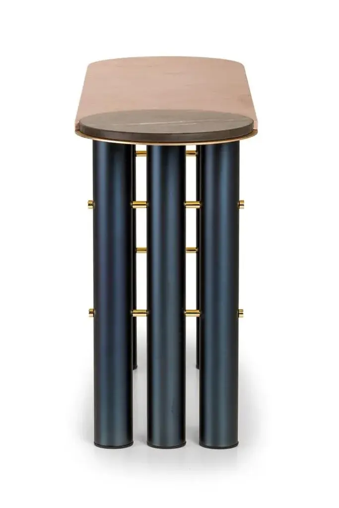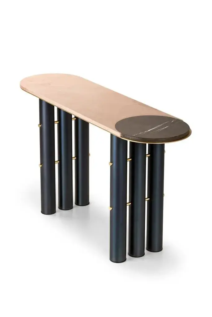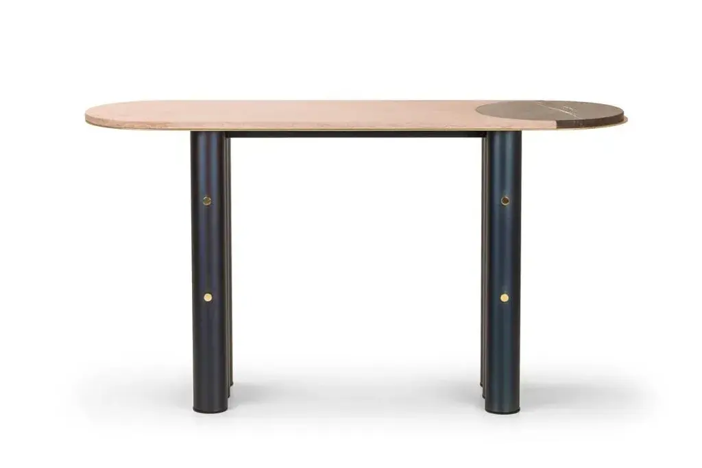 Elephant console by mingardo dimensions: d140 x w40 x h85 cm. Materials: ral 9005 black varnished iron structure, top in marble (black marquina and pink granite), brass details. Weight: 95 kg also available in different finishes. The elephant console is made of geometric elements that, assembled together, generate a product of unusual proportions. The shimmering blue galvanic finishing with brass reflections of the legs, and the pink and black marble of the top, give the console a sophisticated yet informal look.