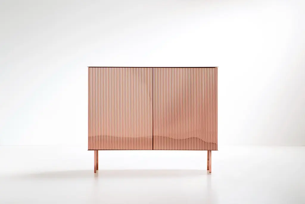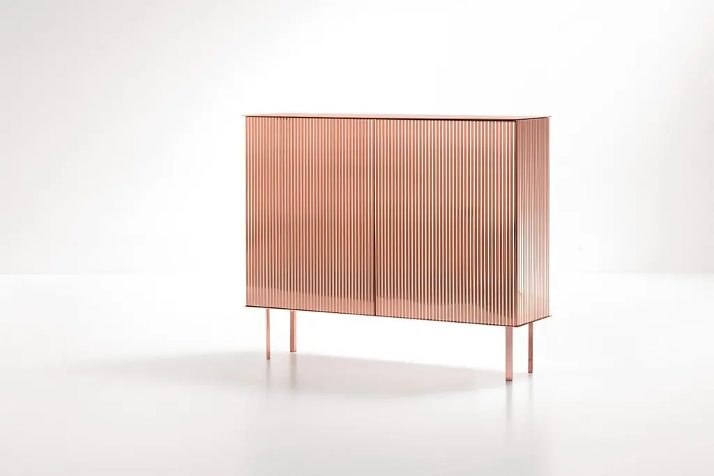 Elizabeth Console Table by De CastelliDimensions: W 122 x D 37 x H 100 cmMaterials: Polished Copper, WoodBrass and Stainless Steel versions are also available. Please contact us for any request.Like a ballerina on her toes, Elizabeth gracefully unfurls her luminous dress, as if made of pleated fabric. The characteristic folds add movement to the metal sheet along the surface of the cabinet, transforming each reflection into light. In an interplay of airiness and tension, elasticity and rigour, the metal vibrates with the rhythm of its pleats. Available in steel, brass or copper, Elizabeth gives shape to a new way of imagining unambiguously feminine metal furniture.DE CASTELLI“HARD COUTURE”Faithful to its decision to reinstate the special role of metal in design and experimentation, De Castelli infuses artisan ideas and workmanship into industrial processes, leading to entirely original results. The encounter with design inspires an approach to materials founded upon respect for their potential, be it hidden or obvious, which emerges slowly in a collection of pieces that, despite being part of a series, remain unique.Unique not only for the hand that has created them, but also for the singular cultural path that focuses on the aesthetic (and not just practical) value of the primordial material with which De Castelli shapes living spaces.A BESPOKE APPROACHEach object, even in the repetition of form, is a creative act in and of itself, one that incorporates a heritage of constantly-evolving expertise and research. The equation that relegates ‘cold’ metals to the margins of furnishing projects is thus overturned, bringing iron, brass and copper, in their infinite variations and finishes, to the centre of an entirely renewed stage, allowing them to finally shine with their own light.SUSTAINABILITYDe Castelli has always been committed to making the entire production cycle increasingly sustainable, aware that metal, the material with which its business identifies itself, is precious and must be treated with care, without waste.PEOPLE FIRSTThe wide spaces of the De Castelli headquarters in Crocetta del Montello (TV) allow those who work to enjoy environments where order, cleanliness and safety are always maintained and guaranteed. An attitude of attention and respect for people that has led to the shared ethical code.