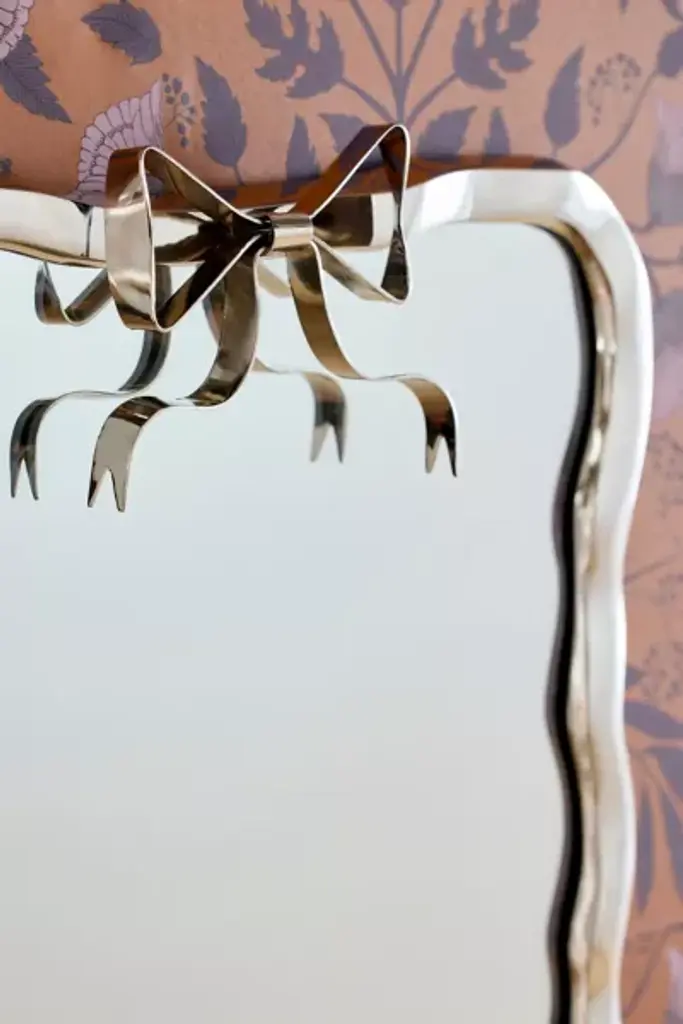 A wall mirror for the femme space, the Eloise Mirror features a wavy frame with a flowing ribbon sculpted at the top. Available exclusively at Urban Outfitters. **Features** \- Eloise Wall Mirror from UO Home \- Aluminum construction with chic metallic finishes \- Bow accenting the top for a femme finish \- Versatile - hang it on your wall or prop it up on your console tables \- UO exclusive **Content + Care** \- Aluminum, MDF, glass \- Wipe clean \- Imported **Size** \- Dimensions: 9.8"l x 2"w x 11.8"h \- Weight: 0.7 lbs