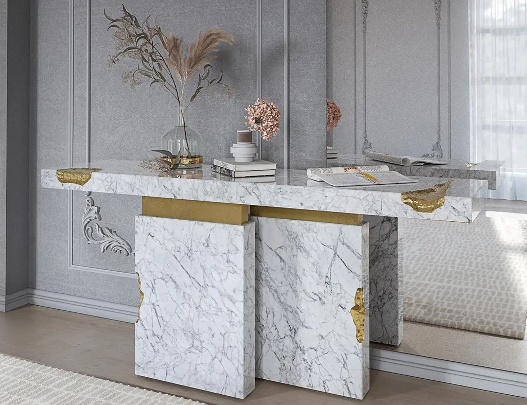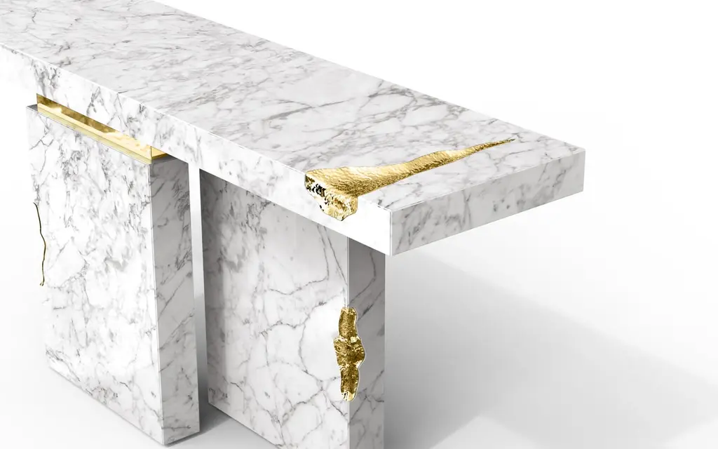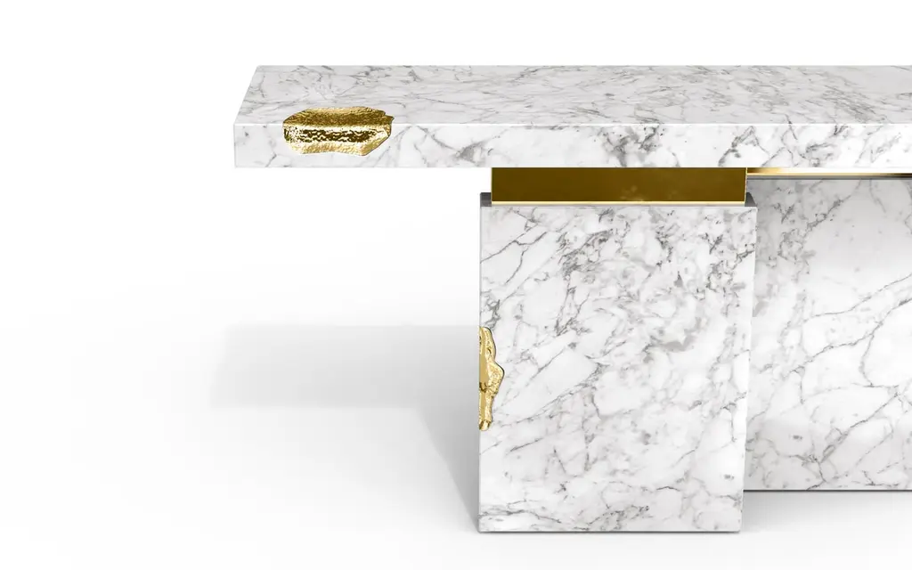 The Empire is a sublime console built in marble with polished brass details. Its cracks are hand-carved and inserted through polished brass sheets, which are hand-hammered for a unique finish. Designed to make an impression, this unique console is a unique masterpiece that will fit perfectly in exclusive entryways or hallways and empowering spaces. A refined statement piece made for those with refined minds and taste.