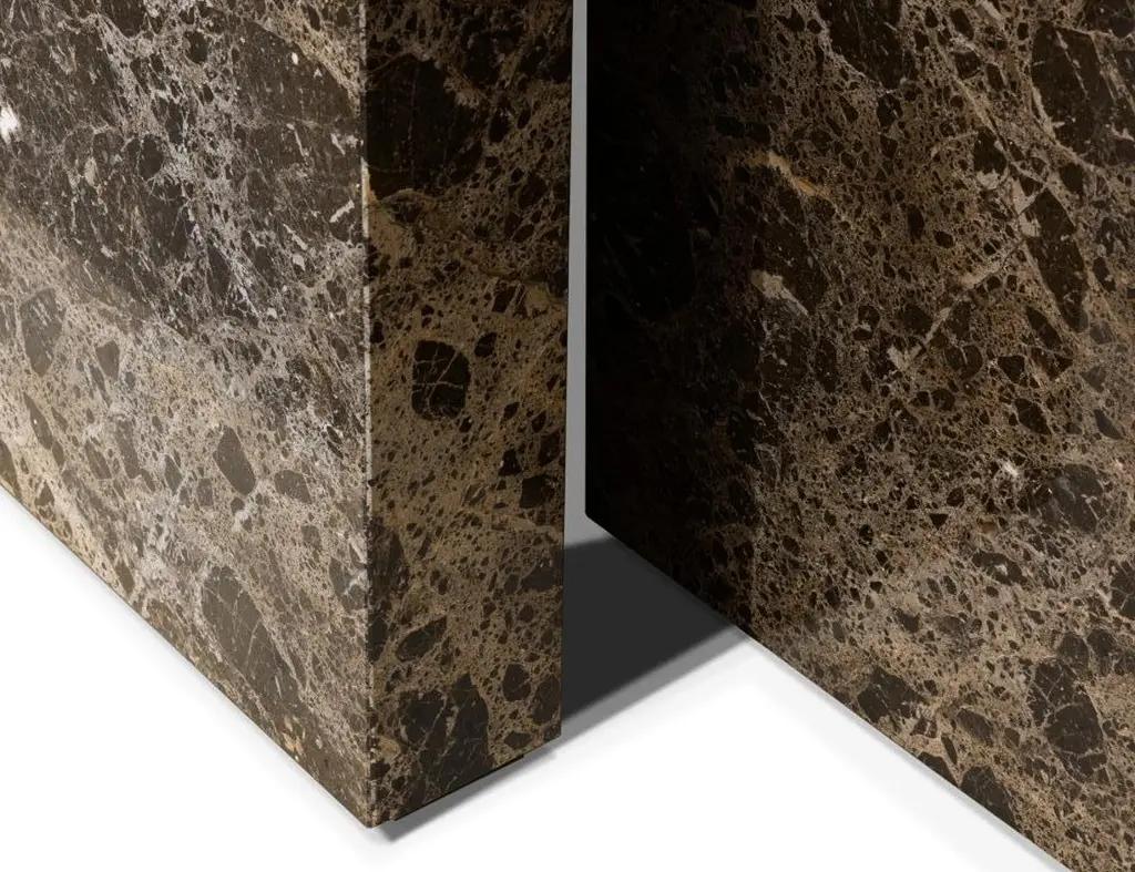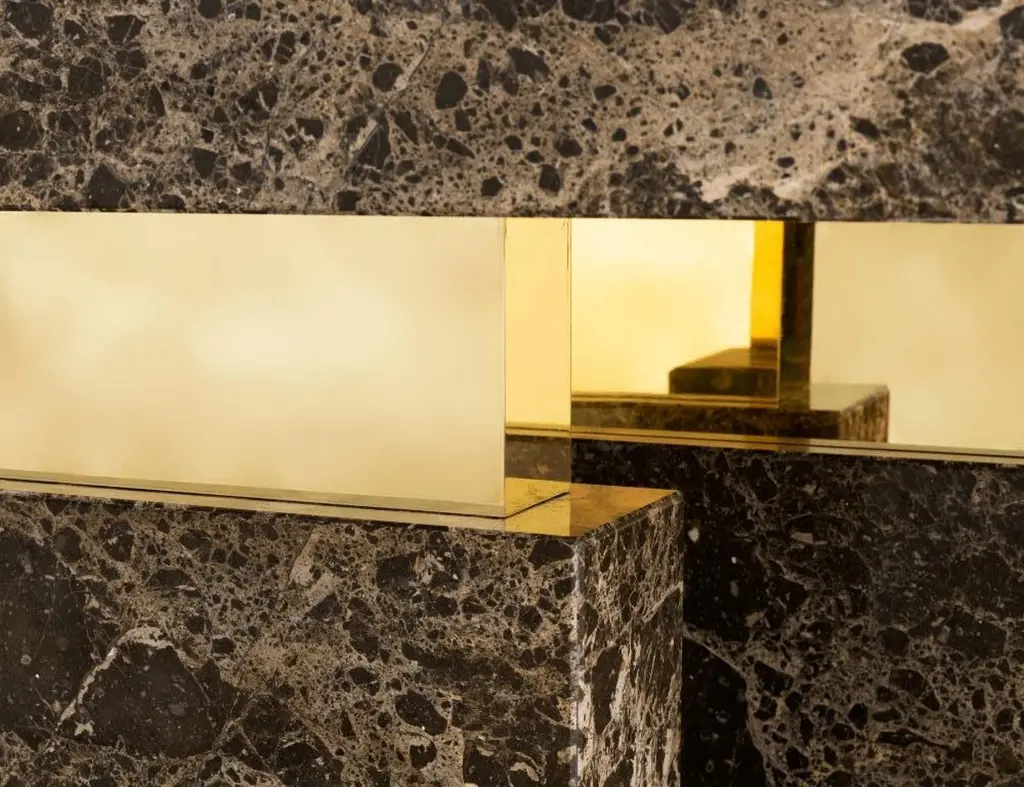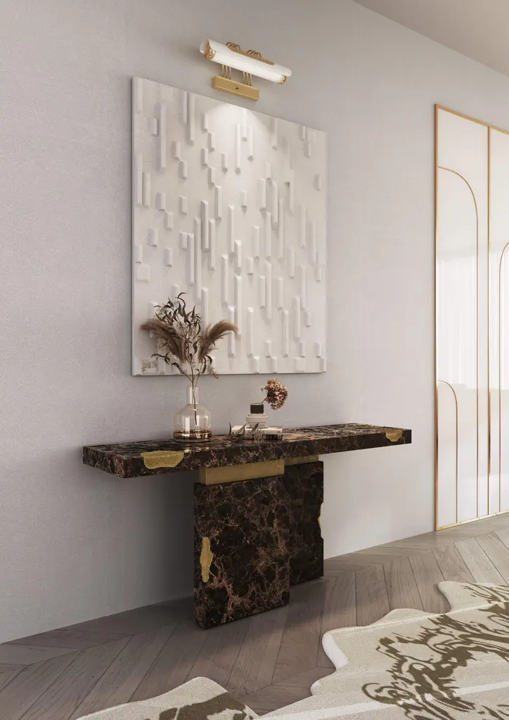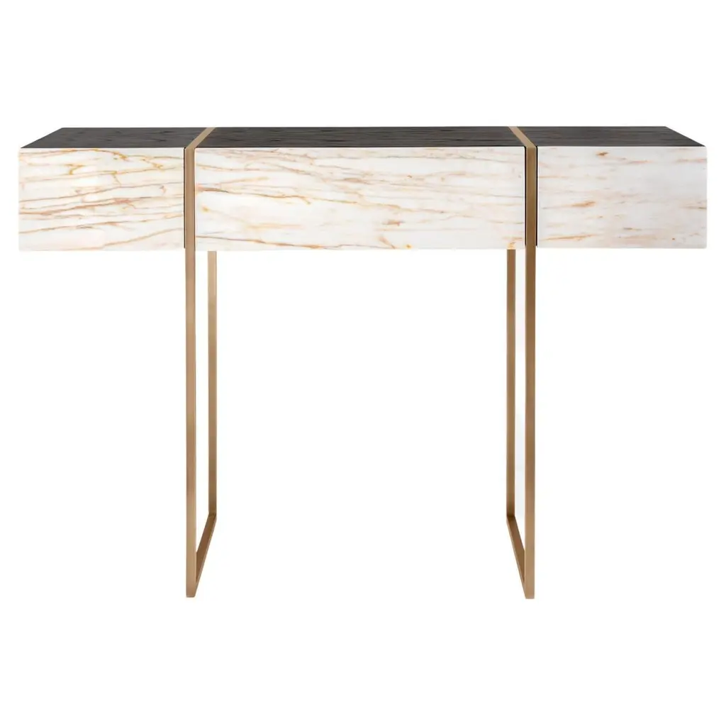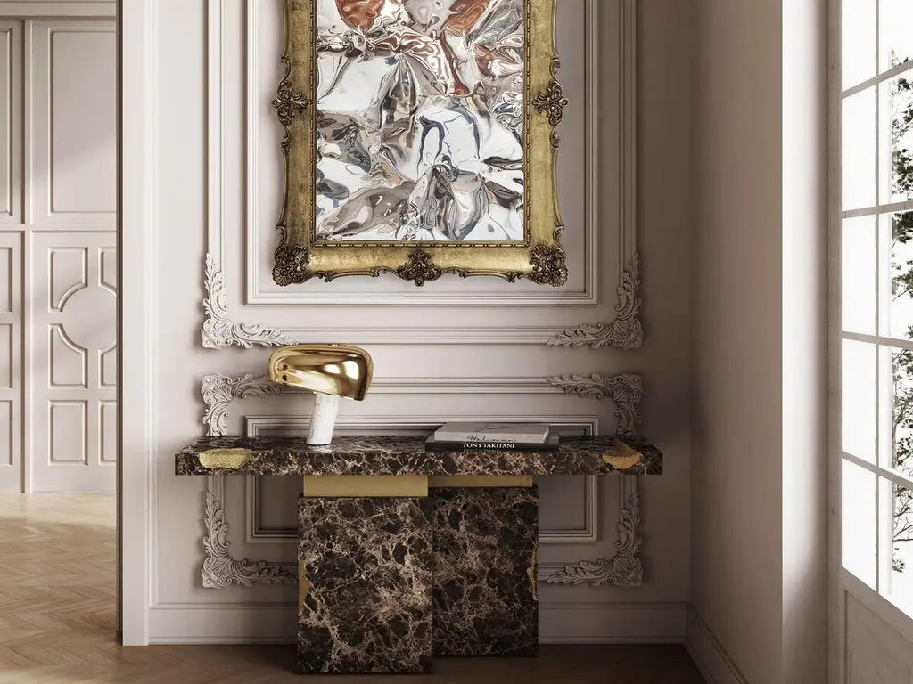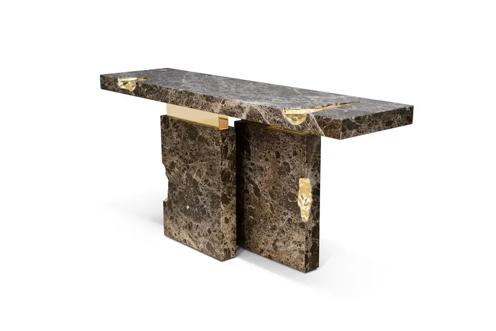 The Empire is a sublime console built in marble with polished brass details. Its cracks are hand-carved and inserted through polished brass sheets, which are hand-hammered for a unique finish. Designed to make an impression, this unique console is a unique masterpiece that will fit perfectly in exclusive entryways or hallways and empowering spaces. A refined statement piece made for those with refined minds and taste.