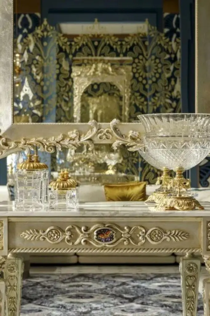 Console inspired by the Empire style characterised by square column legs with Doric-Corinthian capitals, carved decorations of garlands of leaves and rosettes.MaterialsIn patinated silver champagne finish. Frame in Strobo Pine and Lime wood, top in Calacatta gold marble. Optional: insert in minute artistic mosaic.