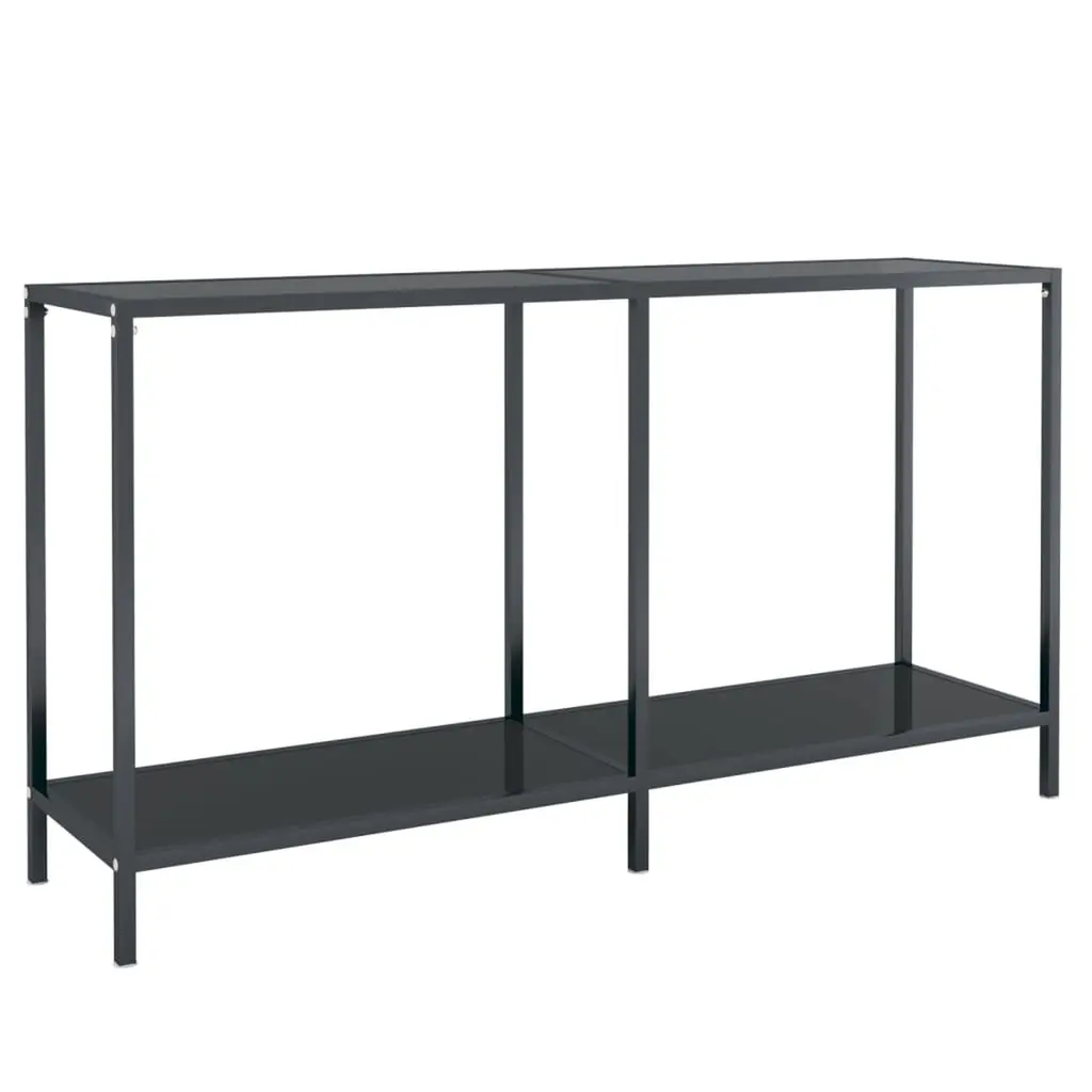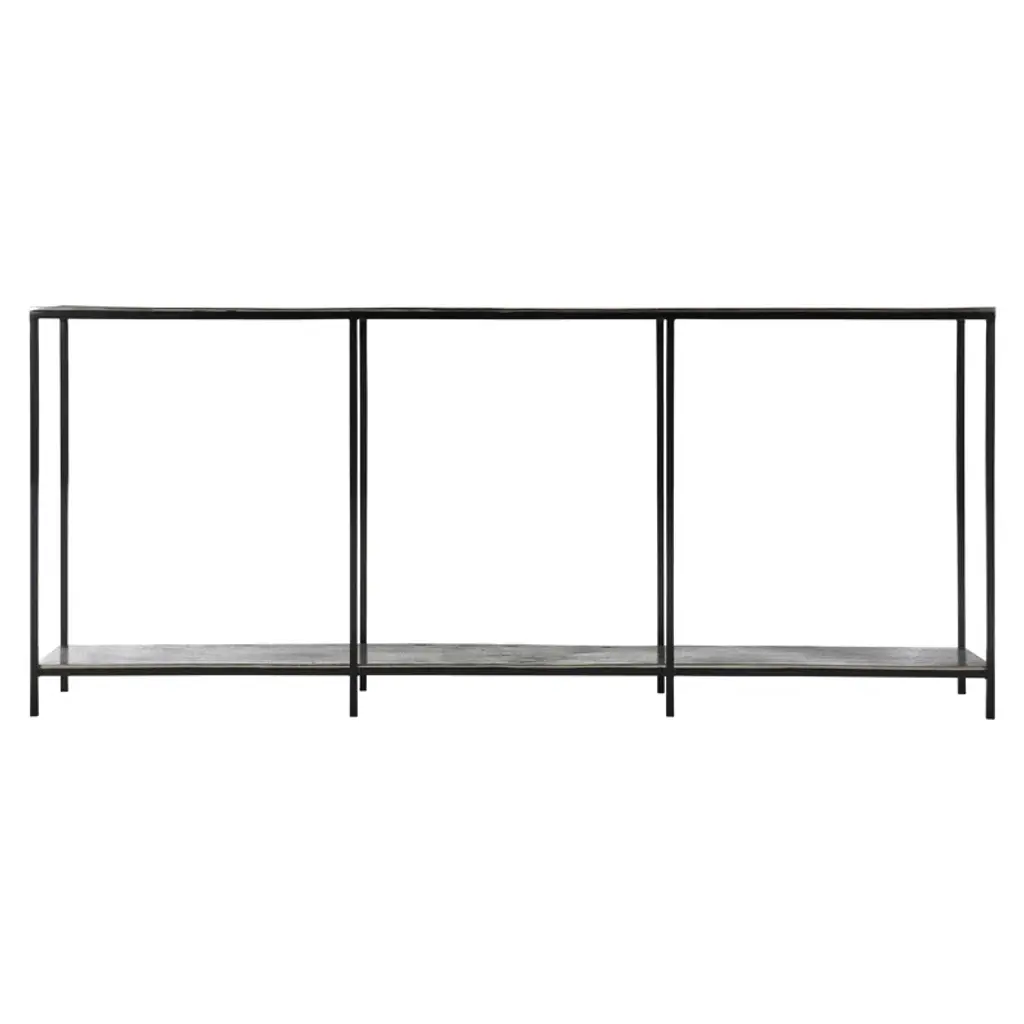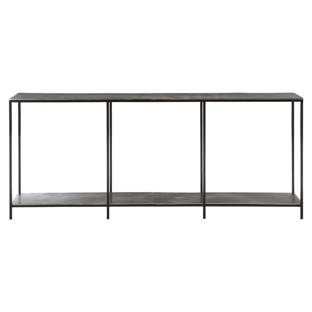 The Equinox console table is a study in modern lines and symmetry. Drawing influence from Bauhaus design, it features a rectangular top, bottom shelf and open center. Cast aluminum surfaces in nickel finish rest upon a black iron frame for a chic industrial look.