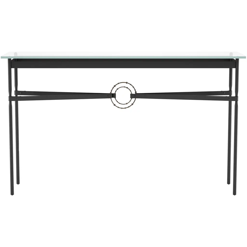 Society meets glam' in the Equus design. Equus Console Tables feature sophisticated details including artisanally-made leather strapping connected by hand-forged and hammered ring elements, reminiscent of martingales. Four fullered legs support a sleek, tempered glass top. Available in all standard finishes.