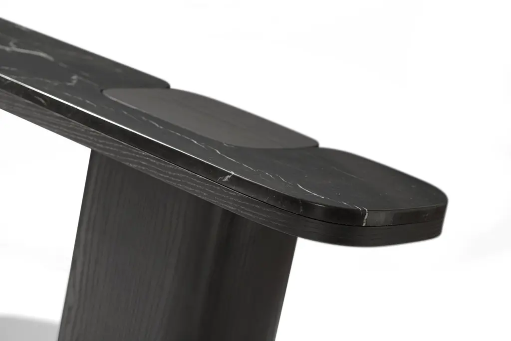 This splendid ash wood console enriched with a marble top could be an unique piece that give a refined design to your entrance. Note the detail of the legs that seem to come out from the marble top.Finishing cod. 33 Carbon (5 Gloss).The marble top is Nero Marquina Marble cat. B, but it is also possible to choose a laquered matte top.Other finishings and marbles are available.The item can be customized.