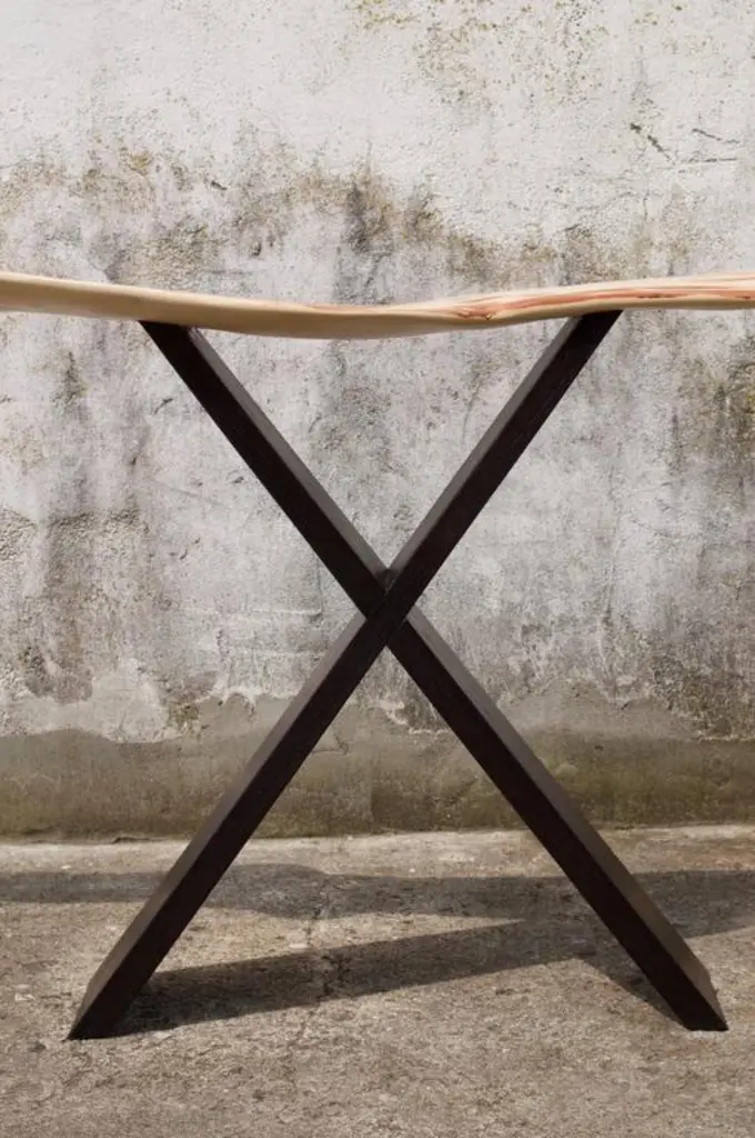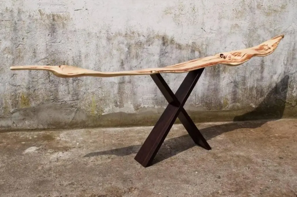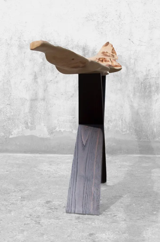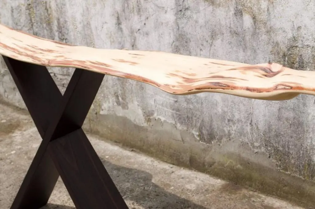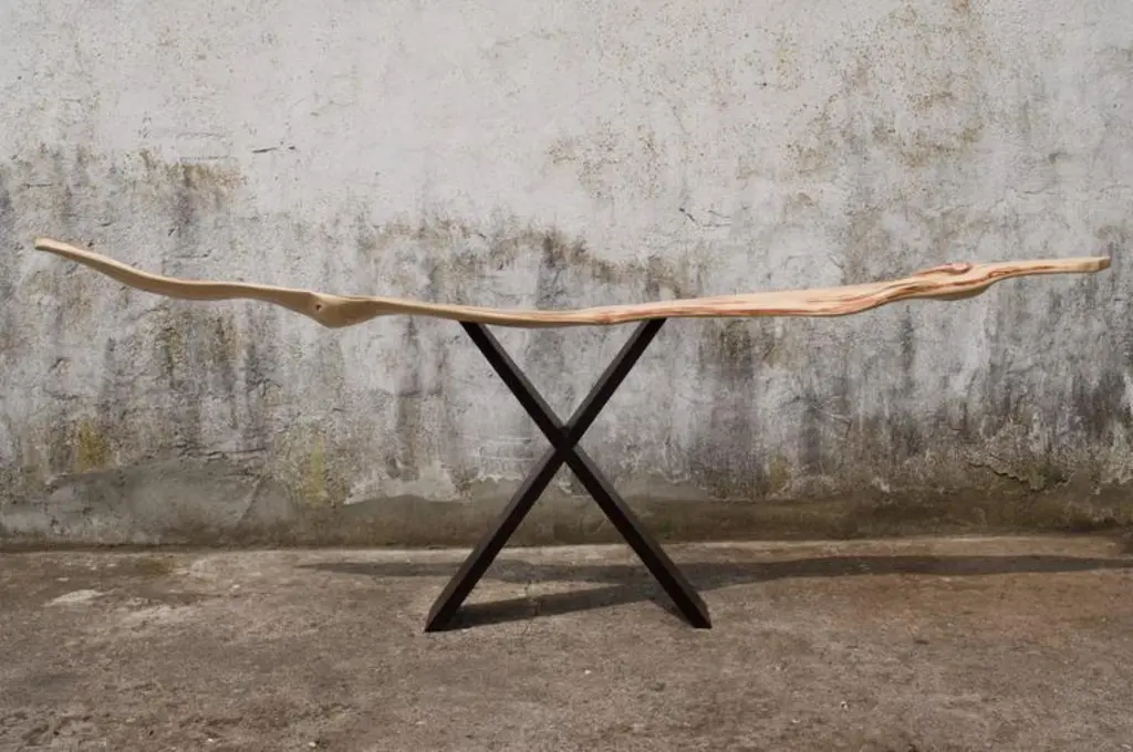 Unique signed console by Jörg PietschmannConsole. Beech, smoked oak, circa 1176.Measures: H 99 x W 263 x D 20 cmWild colorful piece of an old beech tree on a scissors stand of smoked oak.Polished oil finish.In Pietschmann’s sculptures, trees that for centuries were part of a landscape and founded in primordial forces tell stories inscribed in the memory of their fibers.The forms Jörg Pietschmann pares from ancient trees are extensive and astonish with their physical presence, a combination of elegance and primeval nature. Pietschmann’s sculptures are monuments to the trees from which they derive.Being endowed with the ruggedness of primeval matter gives them a veritable vitality: figures that appear to have grown into their sculptural form of their own accord. But Pietschmann’s tangibly present bodies have undergone a considerable degree of metamorphosis.In order to generate these unique tree specimens he examines the tree’s morphology and intrinsic inner map until the courses of its grain, of a curve, knots and cracks concur with his projections. The exploratory process is accompanied by constant modification, giving at the start of each new piece no more than an intimation of the figure that will later emerge. In their completion, Pietschmann’s sculptures once more become universal form.Jörg Pietschmann`s workshop is situated on the countryside close to Hamburg. He works with indigenous timber as oak, lime tree, beech, poplar, olive tree and maple felled by the wind or human hand, together with tropical timber found on his travels.
