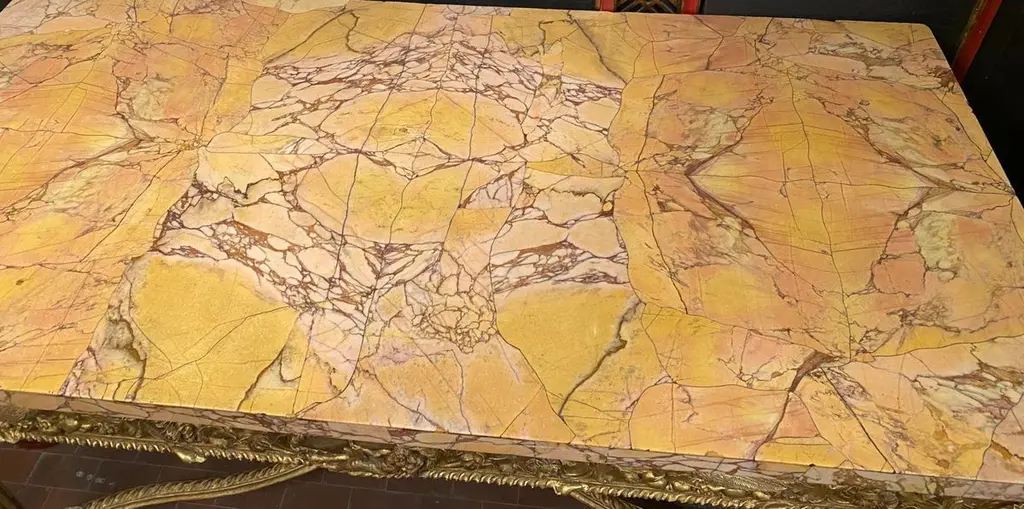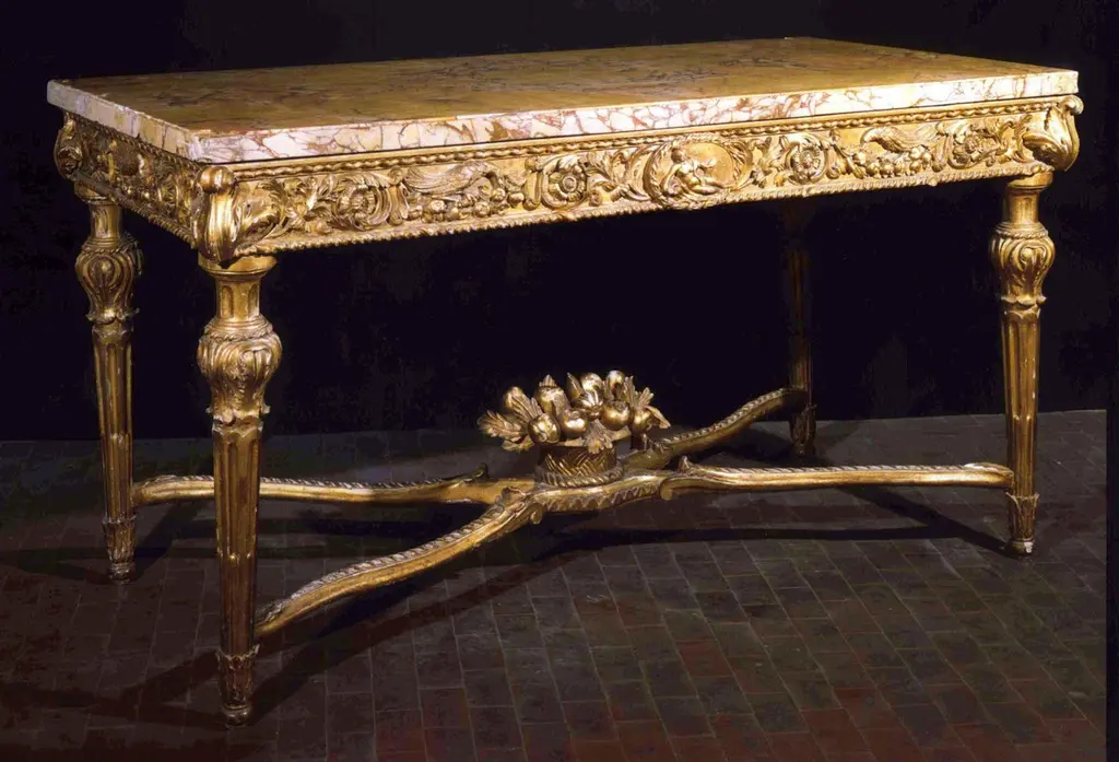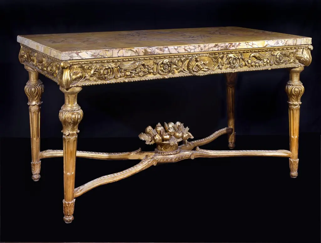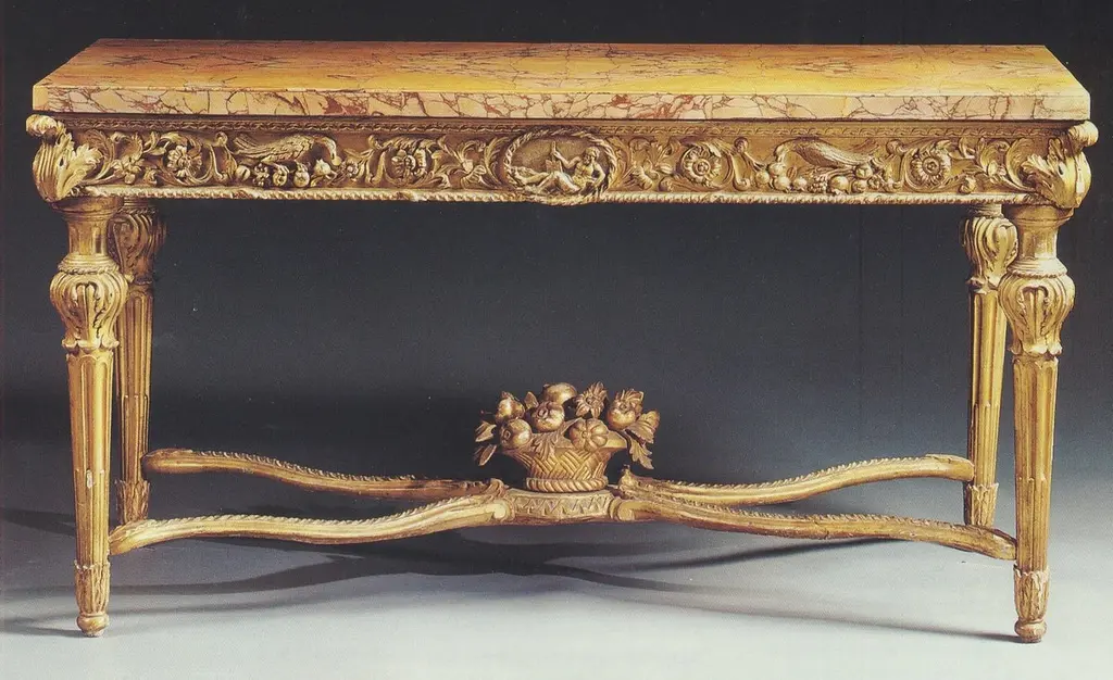 A very fine and important pair of Italian carved gilt-wood console tables, Roman, circa 1770Each with a rectangular back, yellow and white marble top, above a frieze centered by a roundel, one with a recumbent male figure the other with a female figure in drapery, amongst birds and scrolling foliage, with an acanthus leaf clasp at each corner, on leaf-carved stop-fluted legs joined by an X-form stretcher centered by a wicker basket of fruit and flowers;Provenance from a historic Roman PalaceMeasures: 92cm high, 180cm wide, 86cm deep; 3ft. Nin., 5ft. 11in., 2ft. 10in. The frieze decoration and carving is reminiscent of a pair of console tables in the Quirinale, Rome (see Alvar Gonzalez-Palacios, I Mobili Italiani, Milan, 1996, pp.184-185, no.59). Also typical of Roman furniture are the bulbous knees on the feet and the carved wood wicker basket on the stretcher (see Goffredo Lizzani, Il Mobile Romano, Milan, 1970, p. XXXIV, no. LXX).