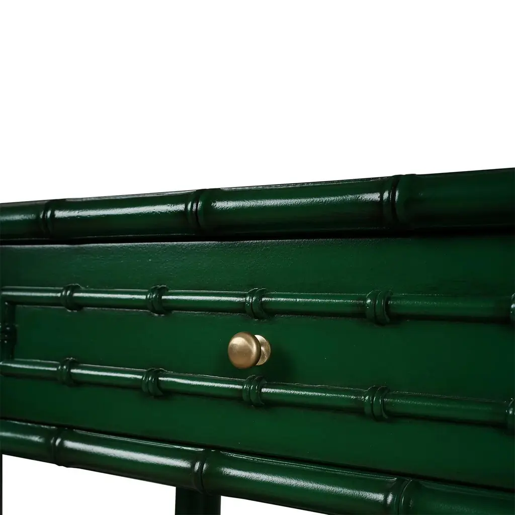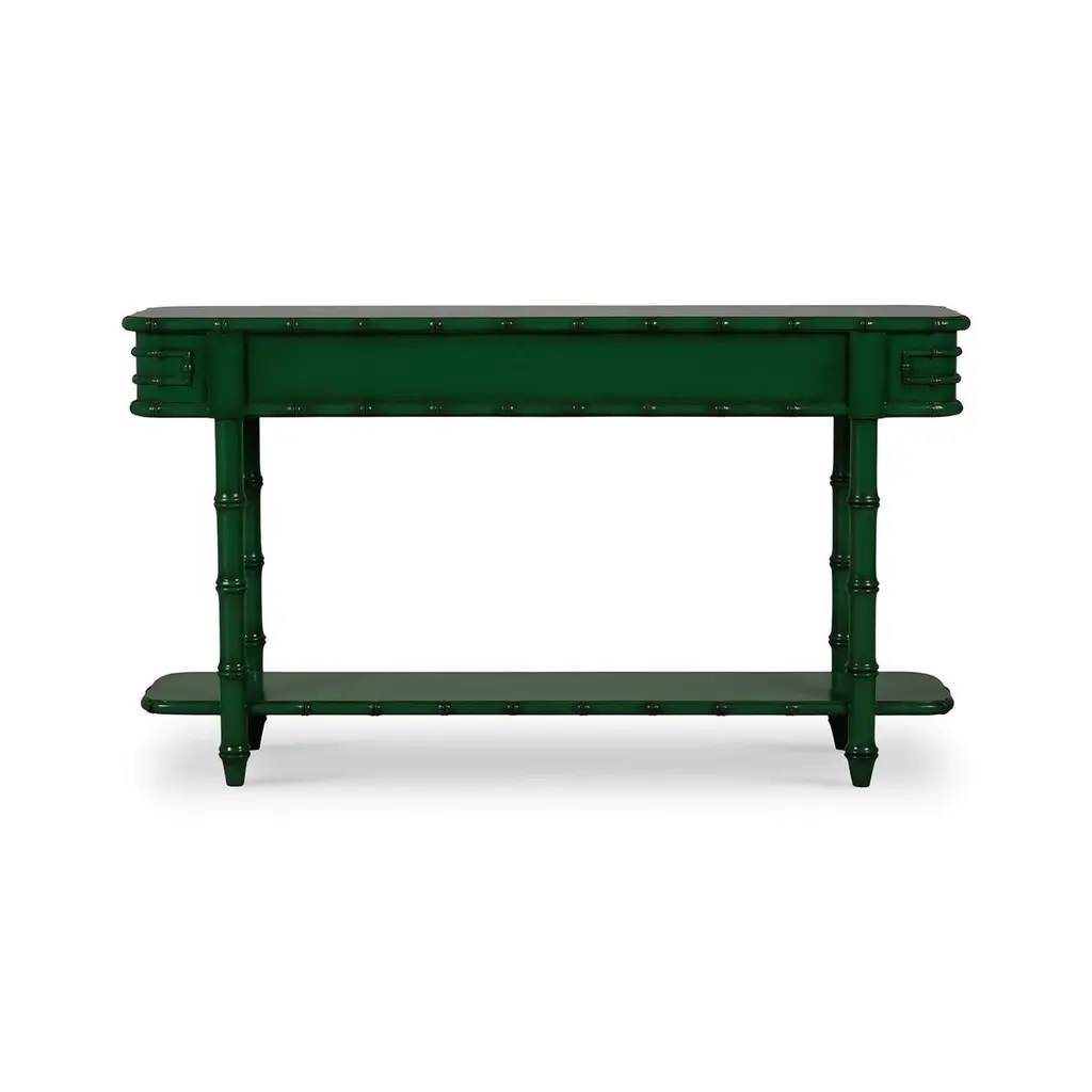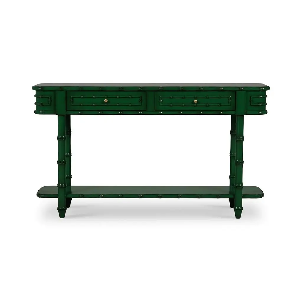 Handmade with solid mahogany and hand-painted in a rich jade green lacquer, this elegant console captures the timeless allure of faux bamboo design with modern sophistication.Its long, narrow silhouette features two storage drawers and a lower shelf, ideal for displaying books, art, or decorative accents. The hand-applied lacquer finish delivers a luminous sheen that highlights the piece’s sculptural bamboo-style legs and rounded corners. A perfect choice for entryways, living rooms, or dining spaces seeking both vibrancy and refinement.Dimensions: 57" W x 14" D x 32" H