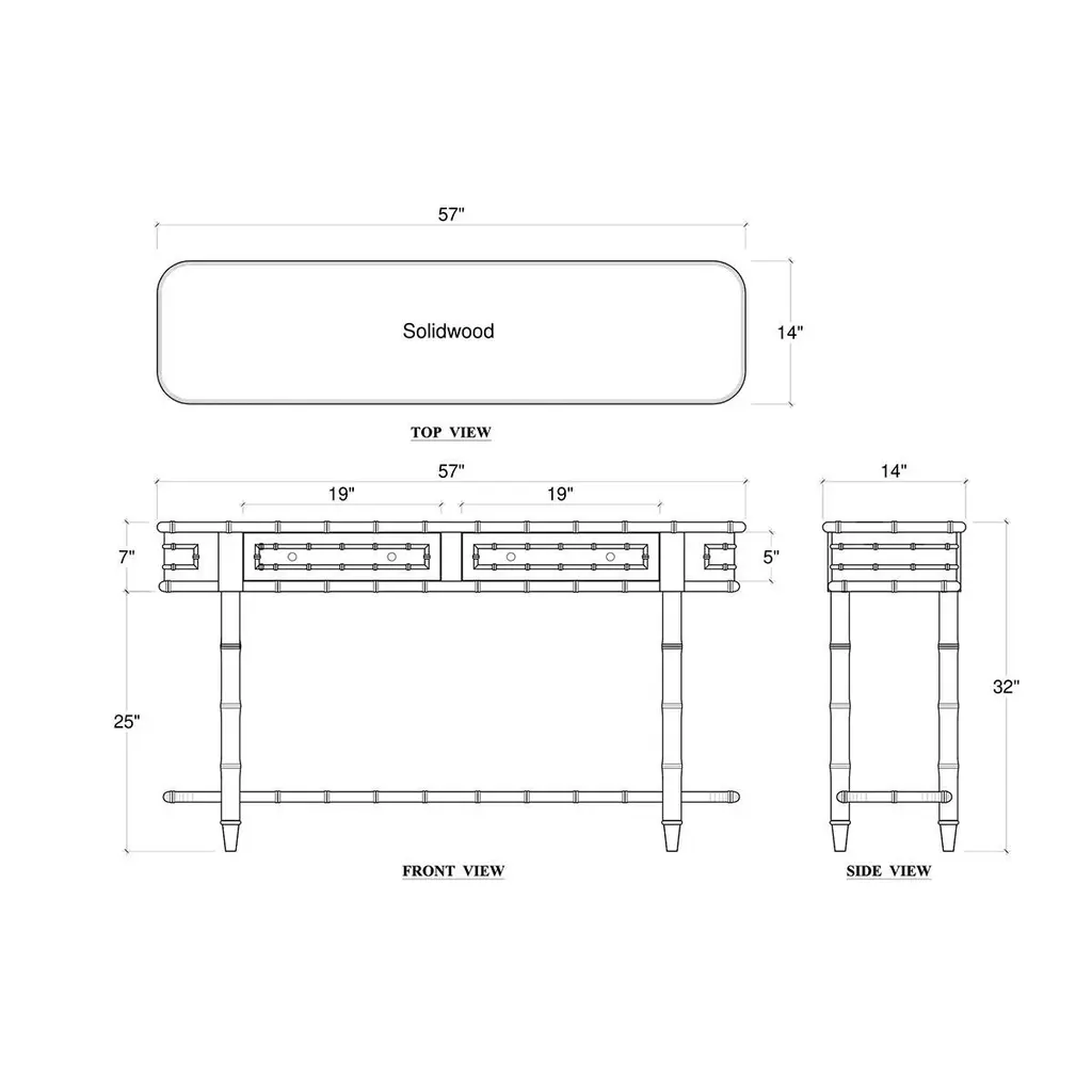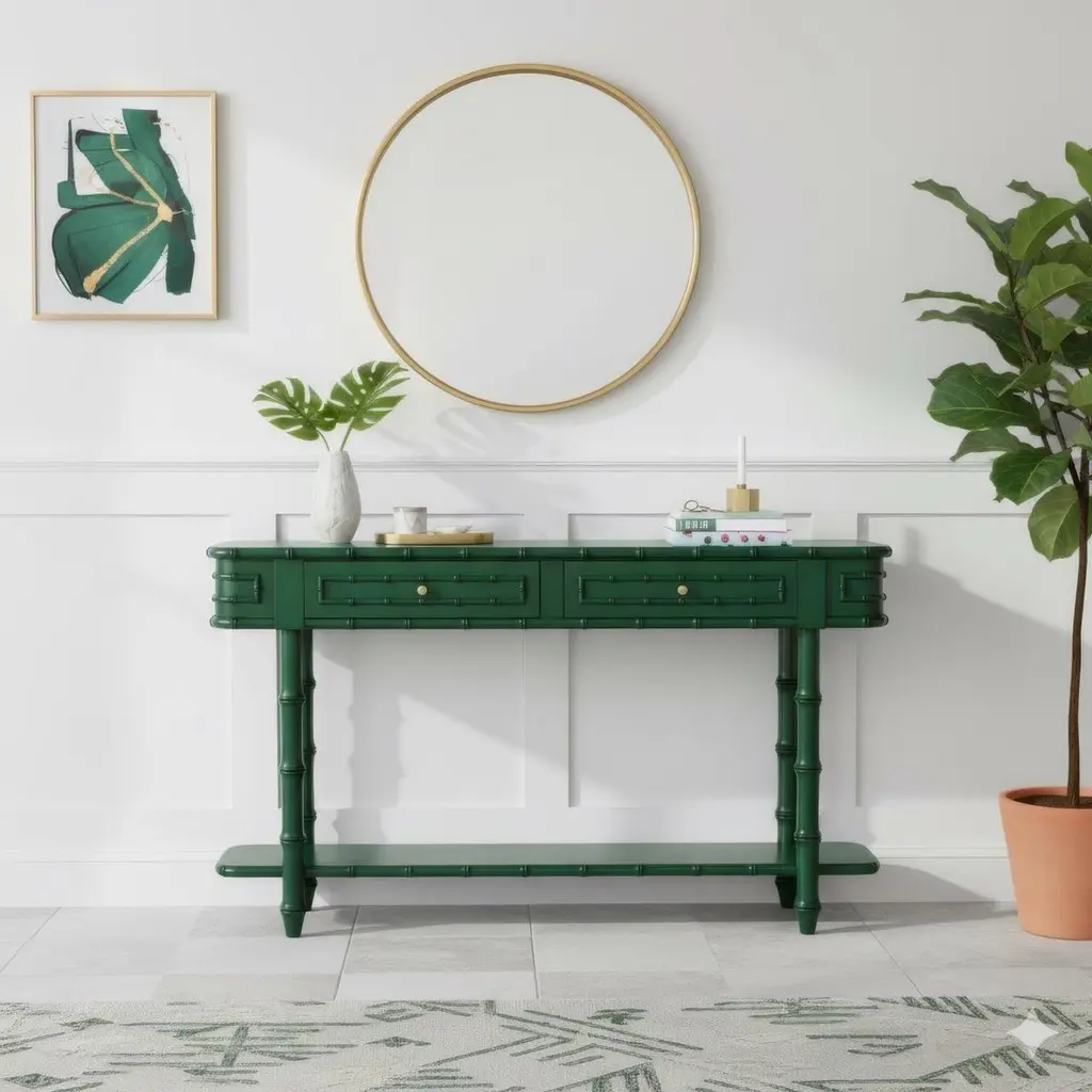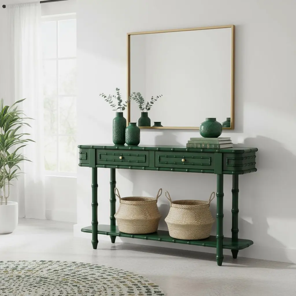 Handmade with solid mahogany and hand-painted in a rich jade green lacquer, this elegant console captures the timeless allure of faux bamboo design with modern sophistication.Its long, narrow silhouette features two storage drawers and a lower shelf, ideal for displaying books, art, or decorative accents. The hand-applied lacquer finish delivers a luminous sheen that highlights the piece’s sculptural bamboo-style legs and rounded corners. A perfect choice for entryways, living rooms, or dining spaces seeking both vibrancy and refinement.Dimensions: 57" W x 14" D x 32" H