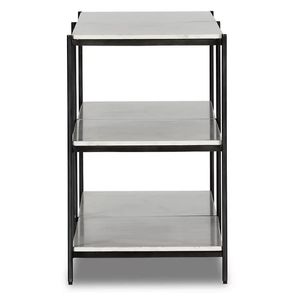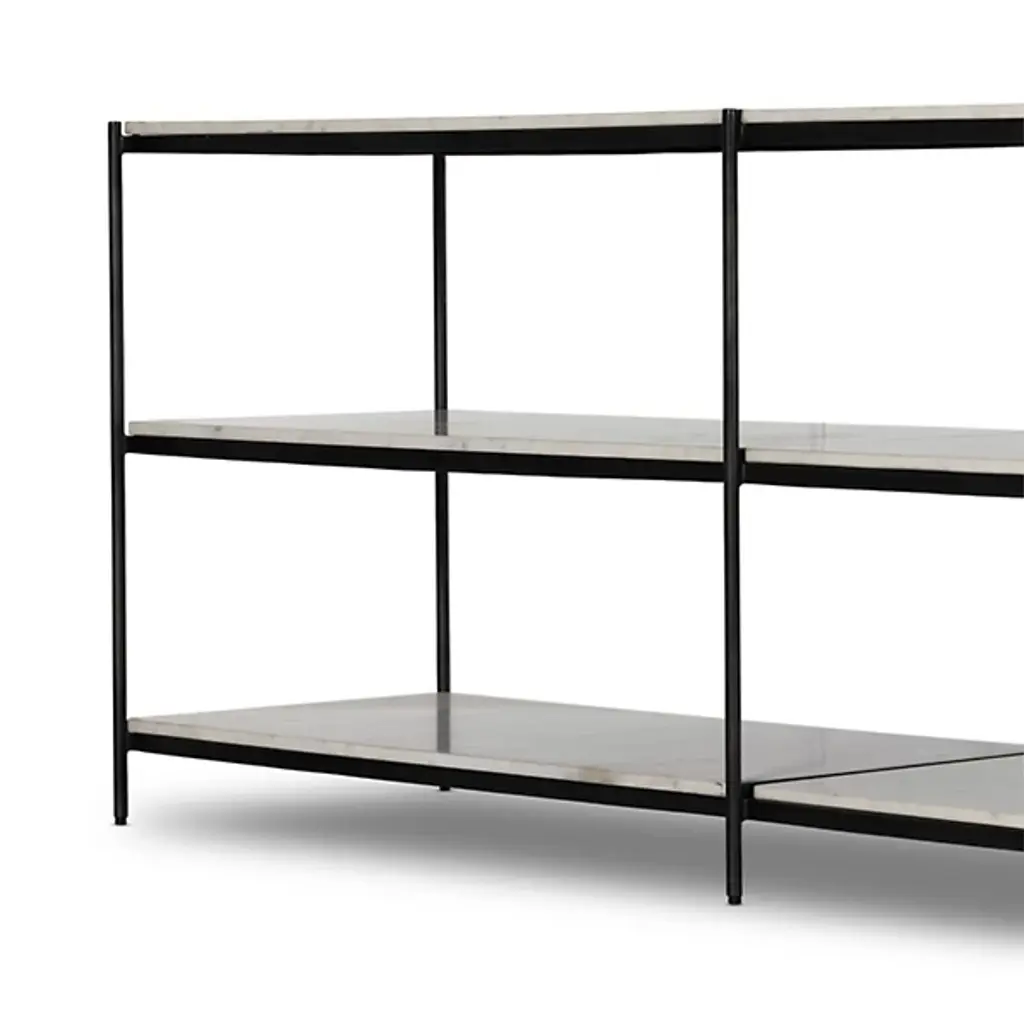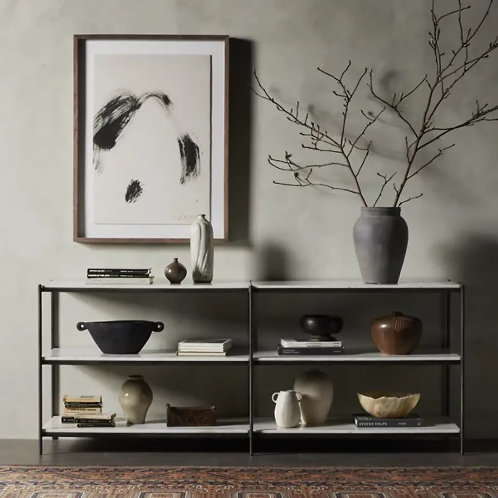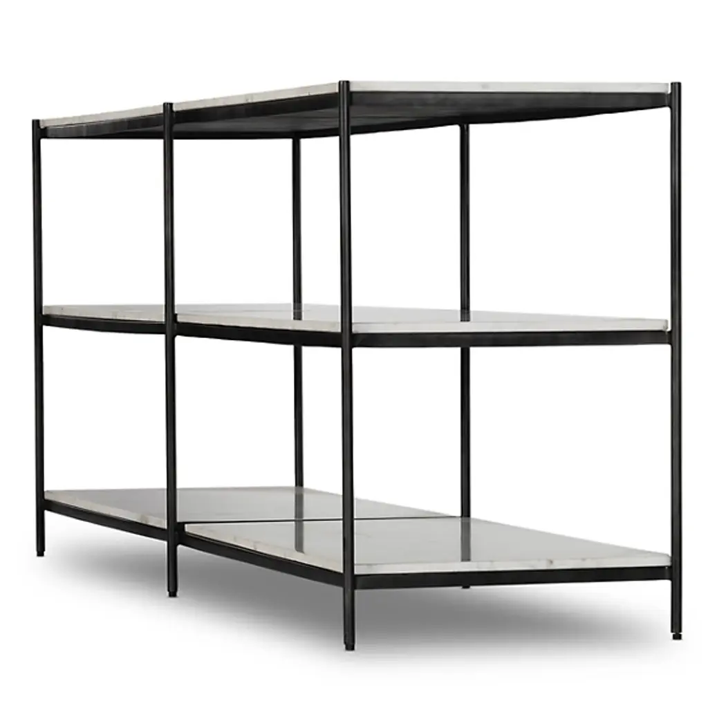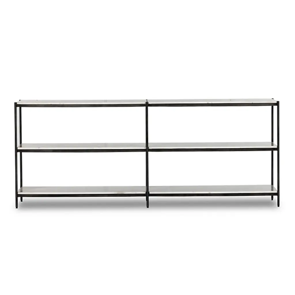 The Felix Large Console Table by Four Hands gives your decorative layout a streamlined look. Your table takes on a linear, geometric shape which gives this furnishment an ultra-slender appearance. The space between this table’s shelves creates intriguing silhouettes. A framework of fine iron is lined with gorgeous marble slabs, which give you ample storage space. Place this console table across from your indoor area rug and prominently display your favorite sculptures, books, and more.