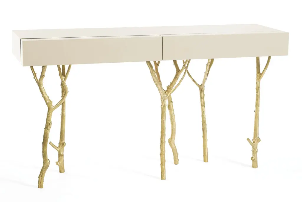Fig Tree Console by Ginger & JaggerDimensions: D 48 x W 160 x H 90 cm. Materials: Silver, nickel, wood veneer, and lacquer.Finish: Top lacquered in Night Jungle; drawer in purpleheart wood veneer in matt, drawer rim in nickel; legs in Silver.This product is suitable for custom size. This product is made for living areas and interior spaces only. This product is not specified for bathrooms, spas, or humid environments. Not suitable for exteriors. Available in different finishes. Please contact us.Launched in Europe in 2012, Ginger & Jagger is a product design brand that prides itself on creating handcrafted high-end contemporary products inspired by Nature.Designed and produced in Porto, a land of craftsmen and age-old tradition, Ginger & Jagger’s Earth to Earth collection is an evocative poetic realm, where Nature’s sculptural shapes are made eternal through handcraft, with unique artisanal techniques and an outstanding blend of superb materials such as brass, silver and copper, marble and stone, and wood.The designer's compass is kept by an uncompromising desire for creative innovation balanced with the integrity of the materials, the artisanal techniques employed, and the brand's very own narrative element.The artisanal techniques availed range from brass casting, wood, and marble marquetry, hand-hammered metals, and hand-sculpted marble.Striving towards sustainability. Ginger & Jagger supports organizations worldwide, with contributions indexed to the products crafted every year.