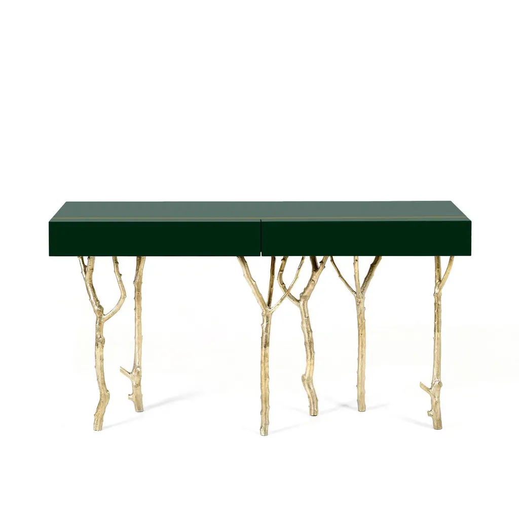 Fig Tree Console by Ginger & JaggerDimensions: D 48 x W 160 x H 90 cm. Materials: Brass, wood veneer, and lacquer.Finish: Top lacquered in Night Jungle; drawer in purpleheart wood veneer in matt, drawer rim in Polished Brass; legs in cast Brass in Brass finishing.This product is suitable for custom size. This product is made for living areas and interior spaces only. This product is not specified for bathrooms, spas, or humid environments. Not suitable for exteriors. Available in different finishes. Please contact us.Launched in Europe in 2012, Ginger & Jagger is a product design brand that prides itself on creating handcrafted high-end contemporary products inspired by Nature.Designed and produced in Porto, a land of craftsmen and age-old tradition, Ginger & Jagger’s Earth to Earth collection is an evocative poetic realm, where Nature’s sculptural shapes are made eternal through handcraft, with unique artisanal techniques and an outstanding blend of superb materials such as brass, silver and copper, marble and stone, and wood.The designer's compass is kept by an uncompromising desire for creative innovation balanced with the integrity of the materials, the artisanal techniques employed, and the brand's very own narrative element.The artisanal techniques availed range from brass casting, wood, and marble marquetry, hand-hammered metals, and hand-sculpted marble.Striving towards sustainability. Ginger & Jagger supports organizations worldwide, with contributions indexed to the products crafted every year.