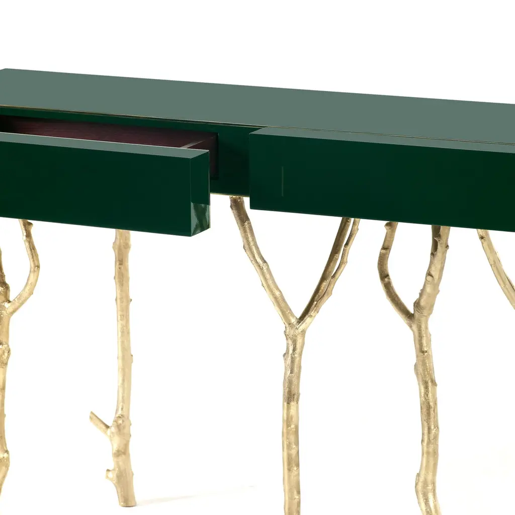 Fig Tree Console by Ginger & JaggerDimensions: D 48 x W 160 x H 90 cm. Materials: Brass, wood veneer, and lacquer.Finish: Top lacquered in Green; drawer in purpleheart wood veneer in matt, drawer rim in Polished Brass; legs in cast Brass in Brass finishing.This product is suitable for custom size. This product is made for living areas and interior spaces only. This product is not specified for bathrooms, spas, or humid environments. Not suitable for exteriors. Available in different finishes. Please contact us.Launched in Europe in 2012, Ginger & Jagger is a product design brand that prides itself on creating handcrafted high-end contemporary products inspired by Nature.Designed and produced in Porto, a land of craftsmen and age-old tradition, Ginger & Jagger’s Earth to Earth collection is an evocative poetic realm, where Nature’s sculptural shapes are made eternal through handcraft, with unique artisanal techniques and an outstanding blend of superb materials such as brass, silver and copper, marble and stone, and wood.The designer's compass is kept by an uncompromising desire for creative innovation balanced with the integrity of the materials, the artisanal techniques employed, and the brand's very own narrative element.The artisanal techniques availed range from brass casting, wood, and marble marquetry, hand-hammered metals, and hand-sculpted marble.Striving towards sustainability. Ginger & Jagger supports organizations worldwide, with contributions indexed to the products crafted every year.
