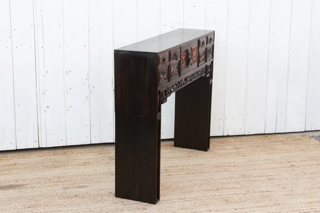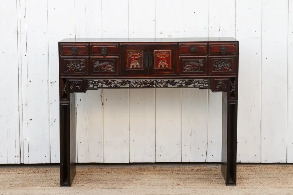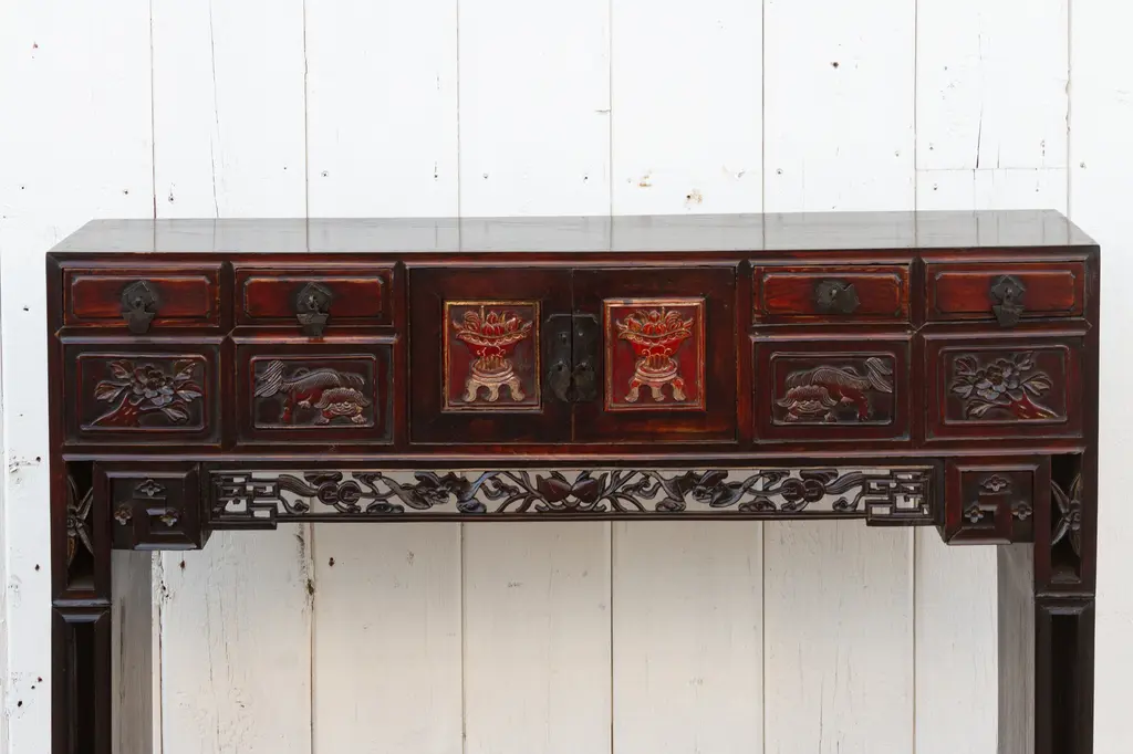 This original Kang table hails from Shanxi province and dates back to the late 19th century. Originally designed for placement on either side of the kang���a raised stone platform utilized as a bed in affluent Chinese households—this Kang table has been raised and repurposed into a one-of-a-kind slim console. Retaining its original lacquer and paintwork, it stands as a functional work of art, showcasing exceptional Chinese craftsmanship.