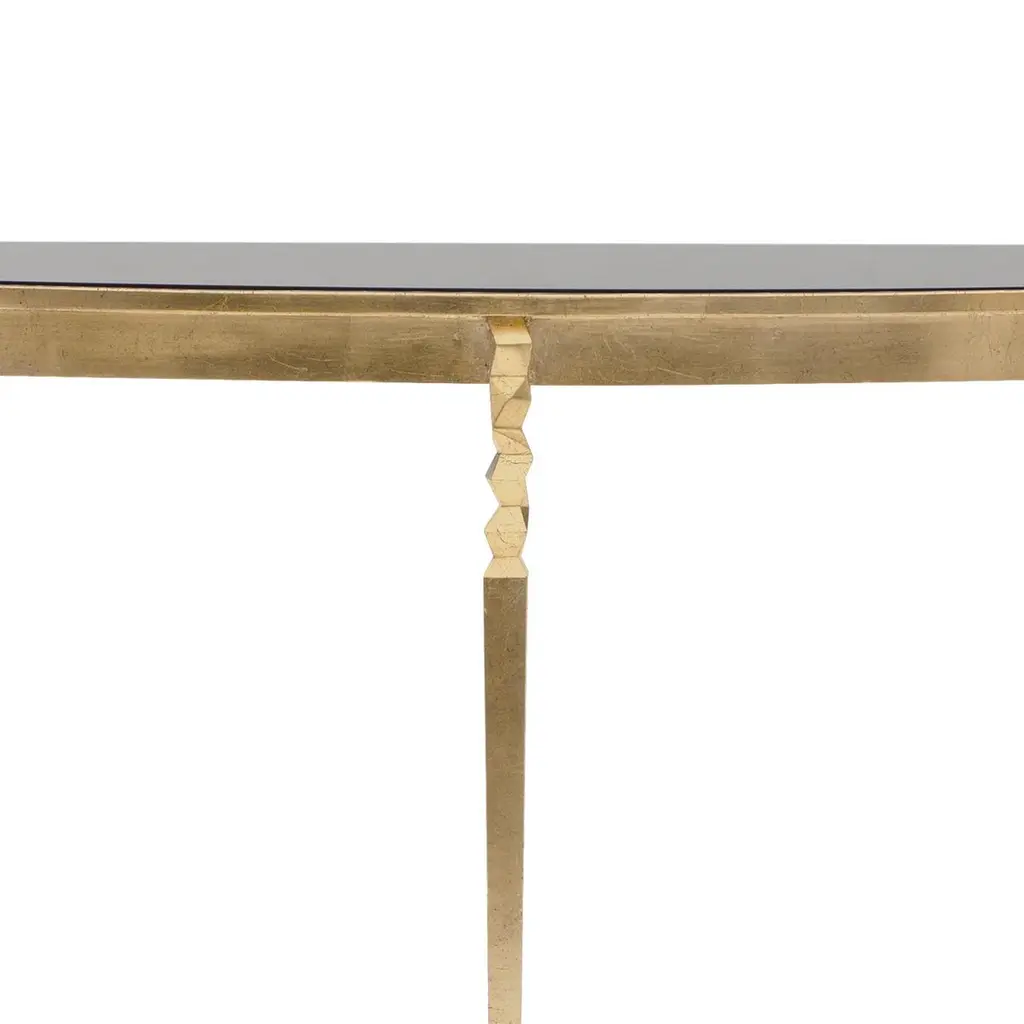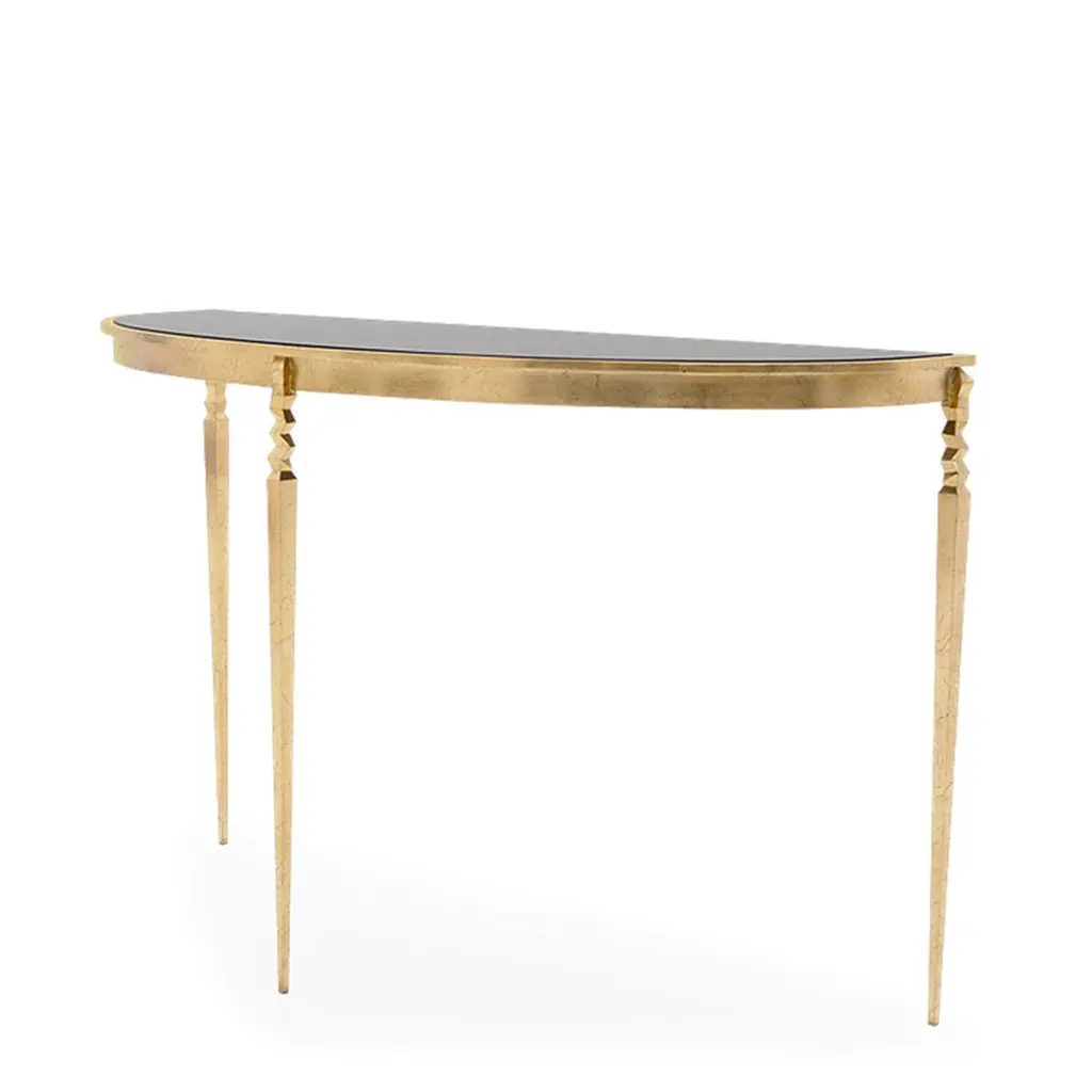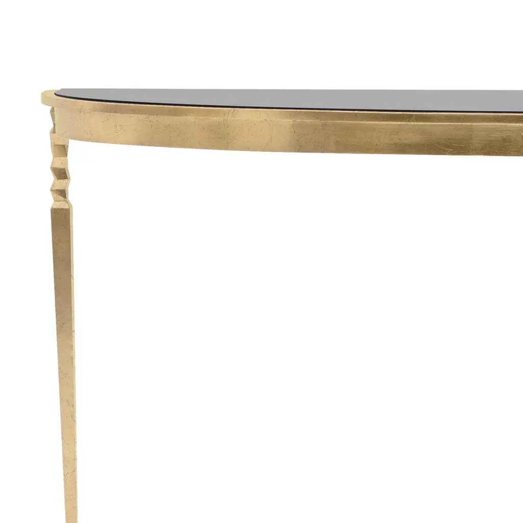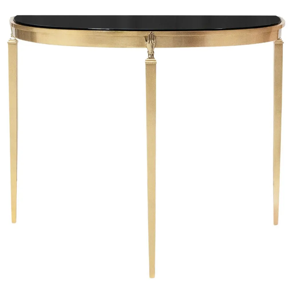 Console table finesse with solid black glass top.On forged iron base in gold finish style oro.Base also available in others finishes on request.