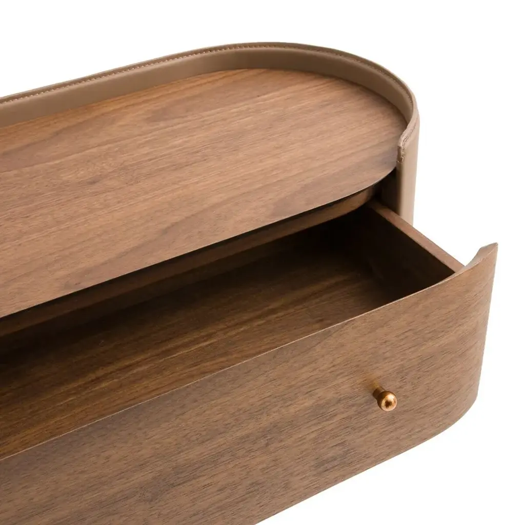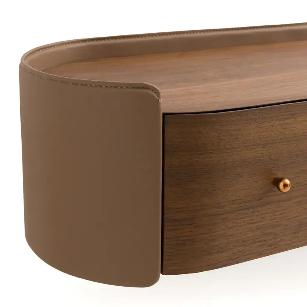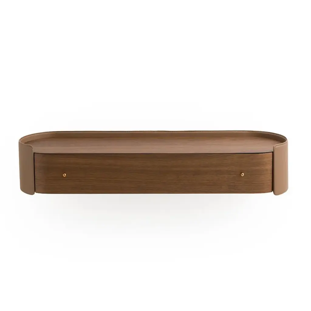 The walnut and leather veneered Firmo wall console takes up the codes of the 1950s with curves that soften the volumes. Its shallow depth and compact dimensions are designed to furnish an entrance hall or corridor.The walls upholstered in genuine Italian leather create an elegant contrast to the walnut veneer of the drawer. A generous and functional console table.MDF structureSides upholstered in genuine Italian leather (cowhide, corrected grain, aniline finish, chrome-tanned)1 large drawer in MDF with FSC® walnut veneer and nitrocellulose finishSoft closing systemGold-plated steel metal buttonsMust be fixed to the wall