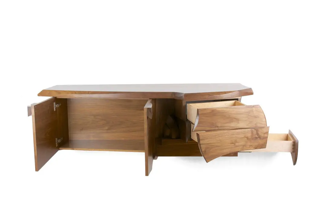 This series lends itself to endless variations. This version explores a smaller size with a sculptural combination of two doors and three drawers. Like always, the drawers do not do what is expected. One of them opens parallel to the wall. The viewer has to discover this. That exploration is always accompanied with a smile! This version is presented in walnut.