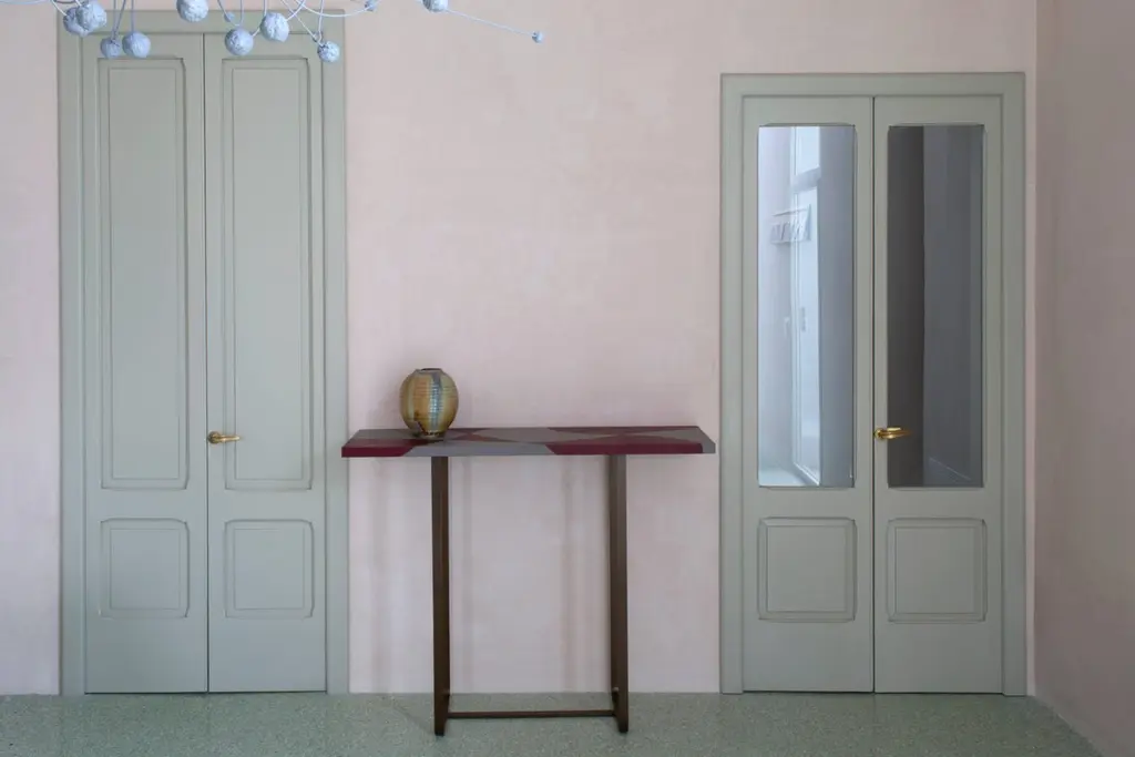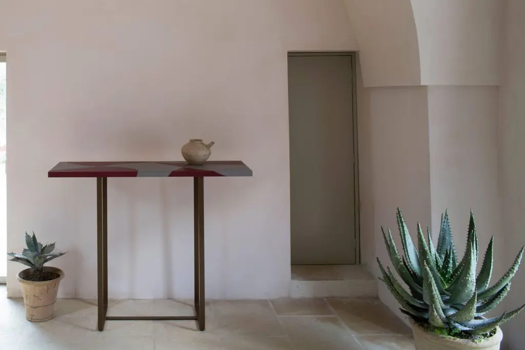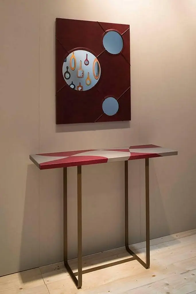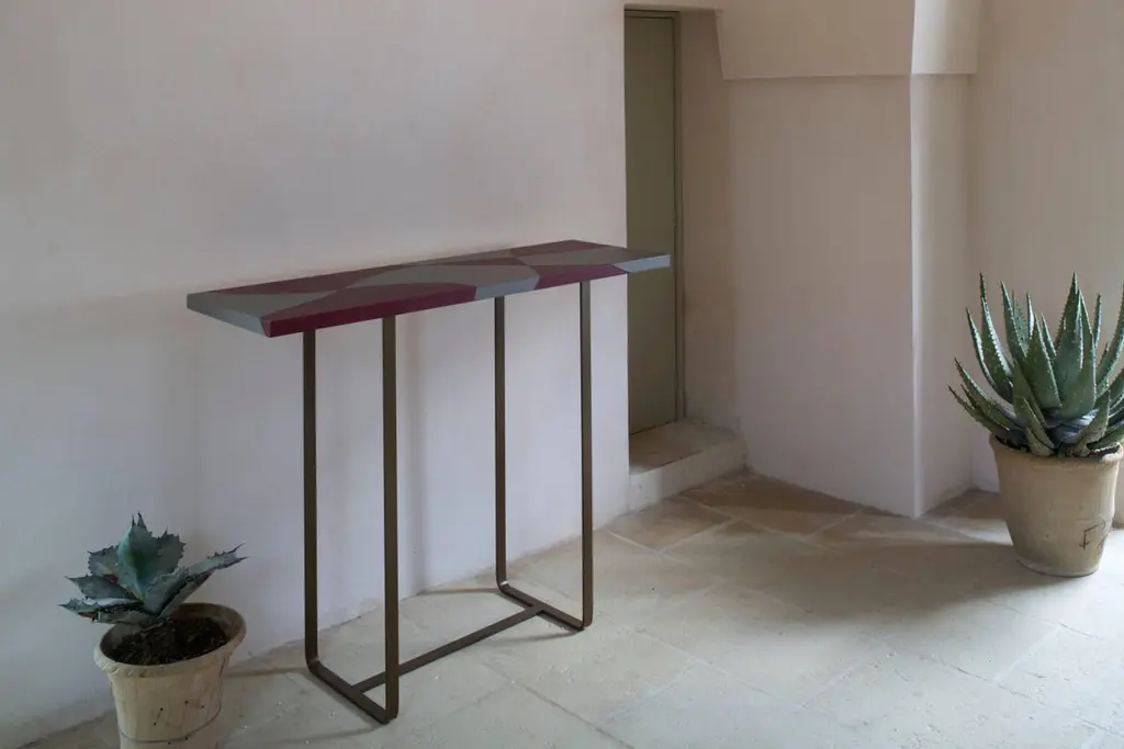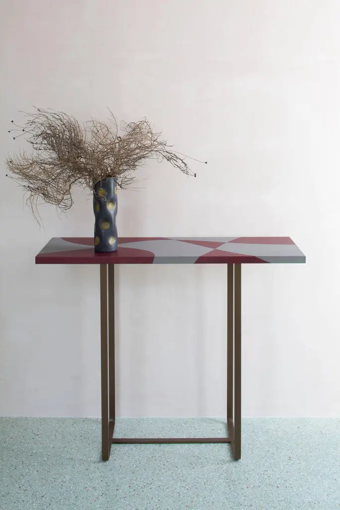 "Flores" is a console table, designed by Nestor Perkal and manufactured by Oscar Maschera, featuring a steel base epoxy powder coated and bronze colored and a tabletop made of honeycomb wood covered by vegetable tanned leather. It's part of the "Isole" collection. Colors combination to be chosen from the available range. Indoor use only.DIMENSIONS:D. 15.7", W. 47.5", H. 37.4"NESTOR PERKAL, born in Buenos Aires, lives and works in Paris. Though he trained as an architect, his work has always been oriented to design and interior architecture. In 1985, he founded an international design gallery in Paris, l’Espace Nestor Perkal, where he was among the first in Europe to show and sell pieces from the “New International Design” movement: Memphis Milano, Mariscal and many others.From 1987-1994, he was the artistic director of the goldsmith’s company Algorithme, where he invited many designers to work on edition projects that were highly successful in France and abroad. As a designer, he has collaborated with Drimmer, Lou Fagotin, Artcodif, Veronese, etc. At CIRVA (International Research Centre on Glass and Plastic Arts), he created the Miroirs collection in 1994-1996.As an interior architect, he has furnished the “café” of the Maison Européenne de la Photographie in Paris, different areas for Cartier and the Cartier Foundation for Contemporary Art, as well as many private apartments and houses. He has been the curator and scenographer of exhibitions held at the Cartier Foundation (La vie en Roses, 1998), at the Galerie Chez Valentin, Paris (“chez Valentin 2000”), at the Passage de Retz (Paris, 2000), at the Museum of Contemporary Art of Rochechouart and at the Grand Hornu in Belgium for the exhibition Désirs d’Objets (2003-2004) and at the Museum des Arts Décoratifs, Paris for the exhibition Editer le design (2006) and 100% Finlandia (2008).He has been the director of the Research Centre on the Arts of Fire and Earth (CRAFT) of Limoges (1993 – 2009), developing strong and lively projects aimed at creating an experimental and artistic connection between industrialists and designers, architects and artists.