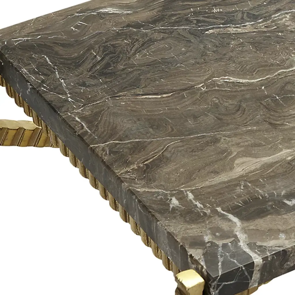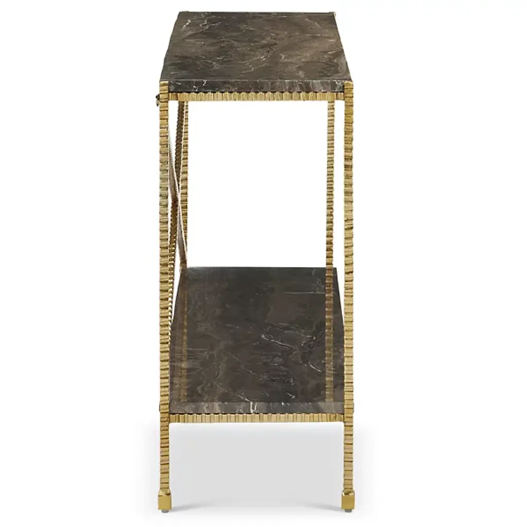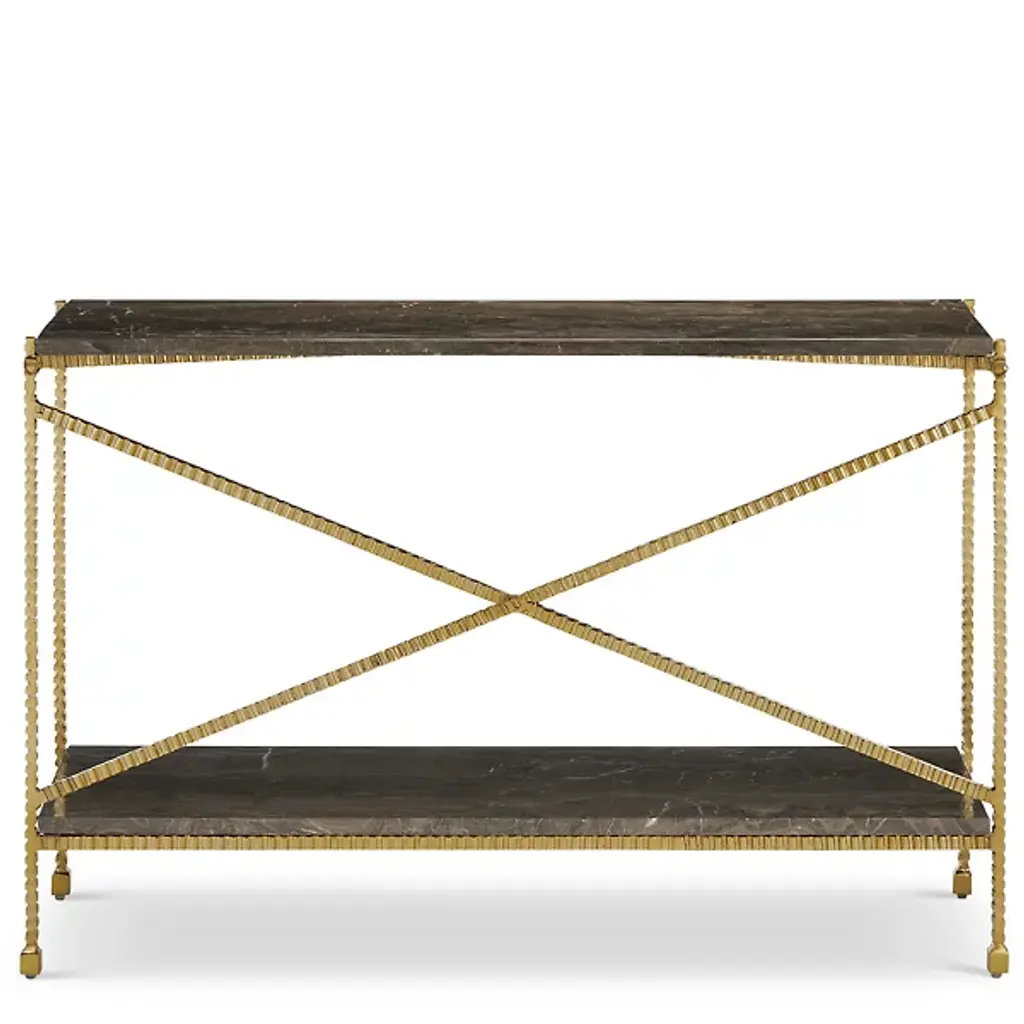 Display cherished mementos in industrial style with the Flying Console Table from Currey & Company. This accent furniture features a rectangular tabletop of natural cappuccino stone that rests above an iron framework. Forming an X, the open iron base boasts geometric ridges and intricate textures for contemporary sculptural flair. Its airy silhouette provides plenty of space underneath to artfully showcase decorative boxes or baskets. Your console table creates an artful showcase for the home.