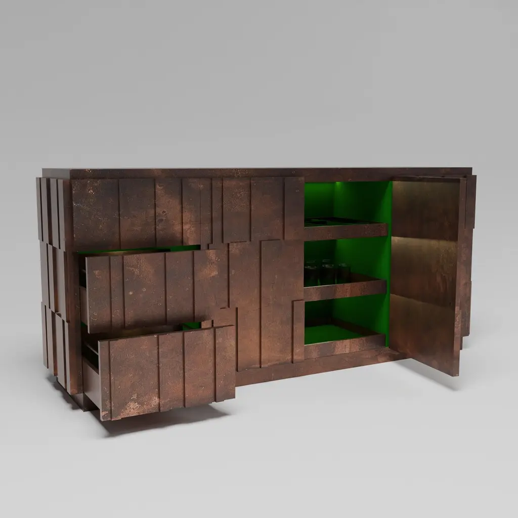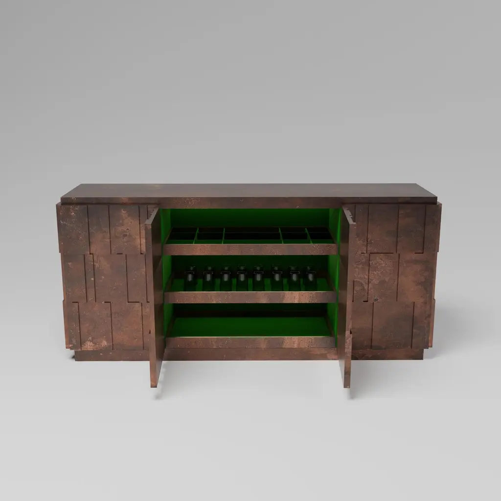 Inspired by Brutalist architecture the Forge Console is a geometric cabinet with a rich, aged copper patina, with layered textures and an industrial yet sculptural vibe. Transform your home with this elegant and timeless cabinet with drawers and shelves to house your collectibles. Can be customised in size, finish and interiors according to specifications. Please note: Each piece exalts the handmade, the painstakingly crafted, the authentic. A piece may have slight variations and tiny imperfections but these are the marks of an artisan, a testament to the individuality of each work of art. It is our belief that these variations infuse our objects d'art which desire and we assert our right to make the necessary qualitative changes. Prices do not include VAT. VAT may be applied depending on the ship-to location.