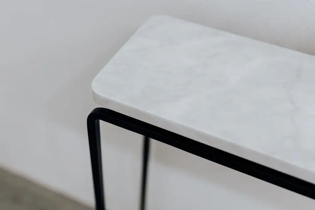 Form-C S White Console Table by Un’commonDesigned by Małgorzata Korycka.Dimensions: D 20 x W 60 x H 73 cm.Materials: Steel and Carrara marble.Available in different marble options. Please contact us.FORM-C is the only console in the BASIC collection. The top is slightly raised, and the rounded corners perfectly correspond to the rounded shape of the frame. All of these details combined are the reason this unique console has such a delicate and modern form.Our Polish workshop designs and hand-makes furniture from marble and steel. Our furniture should not only be well-designed – it should be a feast for the senses. Nothing can produce this effect quite as good as marble.It is a beautiful, refined, natural material used for centuries in architecture, art, and everyday life. There are many different stone quarries, offering different types and colors of marble. However, because it is a natural material formed in a very complex process, it is virtually impossible to extract two identical pieces of stone. In our opinion, in a world ruled by plastic and mass production, this thrill of surprise is a bit of genuine luxury, reserved only for natural materials and their enthusiasts.Thanks to the physical properties of stone and precise workmanship, Un’common furniture is built to last. Over time, a natural patina may form on the surface, adding extra charm to your beautiful and refined furniture, which – if treated well – will reward you every day. Nothing can beat the taste of coffee when you drink it at a marble table.