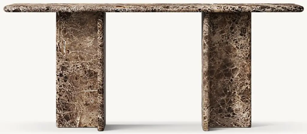 MONOLITHIC FORMS SOFTENED BY GENTLE EDGES. WITH ITS BOLD MARBLE PATTERNS CUBO IS AS VERSATILE AS IT IS STRIKING.DIMENSIONS:50”L x 17”W x 36”H: - 48”L x 15”W x 1.5” THICK TABLETOP WITH WITH 6" RADIUS CORNERS - 17”L x 7”W LEGS- TOP 1" OFFSET FROM LEGS - 2” CUTOUT(S) ON UNDERSIDE OF TABLE TOPCONSTRUCTION:TABLE TOP: - 3/4”x 2 SLABS WITH EASED EDGE- HOLE(S) IN TABLE TOP INTERLOCKS WITH BASE OF TABLEBASE:- HOLLOW CONSTRUCTION USING 3/4” STONE SLAB OR 304 STAINLESS STEEL- FELT LINING TO BOTTOM OF BASE FOR FLOOR PROTECTION- STONE FINISH TO TOP OF BASE ON ALL STONE VARIANTSWEIGHT:50”L x 17”W x 36”H ALL STONE: - GROSS WEIGHT INCLUDING WOOD CRATE 480LBS