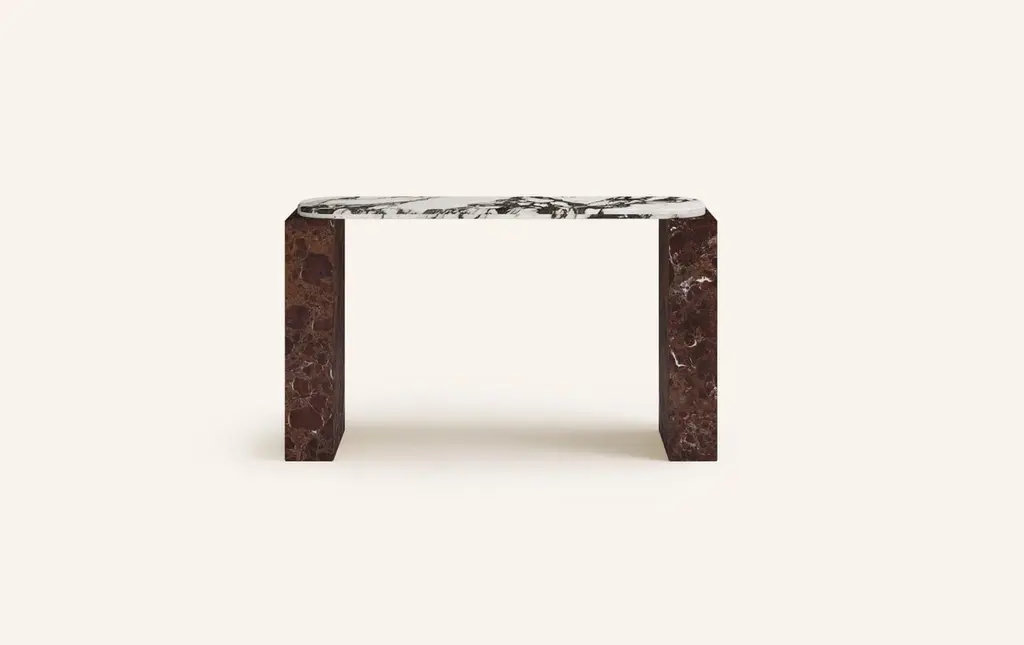 Form(la) Cubo Console Table 62”l X 17”w X 36”h Calacatta Viola & Rosso Marble