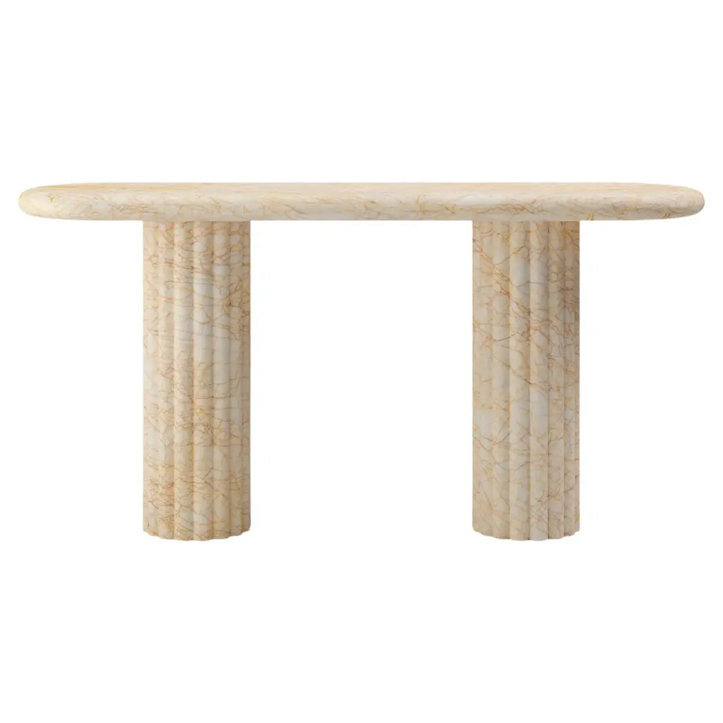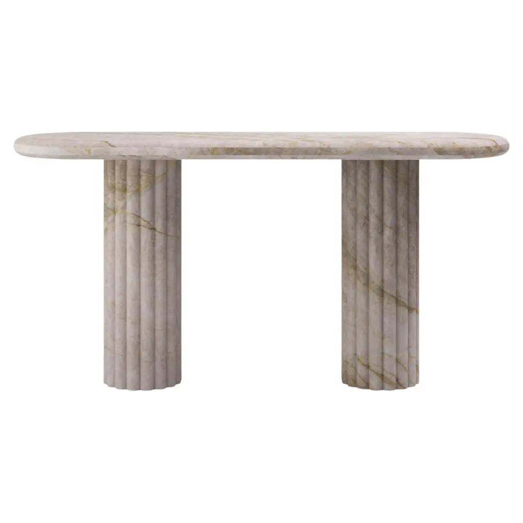 OUR MOST COVETED COLLECTION AND MODERN TWIST ON AN ANCIENT ROMAN CLASSIC. RECENTLY REFRESHED WITH A MORE PLAYFUL AND ROBUST PROFILE.DIMENSIONS:48”L x 16”W x 30”H: - 2.25" THICK TABLE TOP- 10"Ø FLUTED BASE(S) WITH 2" FLUTES- 6.25"Ø CUTOUT IN TABLE TOP WITH 6"Ø INTERLOCK ON BASECONSTRUCTION:TABLE TOP: - 3/4”x 3 SLABS WITH FULL BULLNOSE- HOLE IN TABLE TOP INTERLOCKS WITH BASE OF TABLEBASE:- HOLLOW CONSTRUCTION USING 3/4” STONE SLAB- FELT LINING TO BOTTOM OF BASE FOR FLOOR PROTECTION- STONE FINISH TO TOP OF BASEWEIGHT:48”L x 16”W x 30”H: - GROSS WEIGHT INCLUDING WOOD CRATE 474LBS